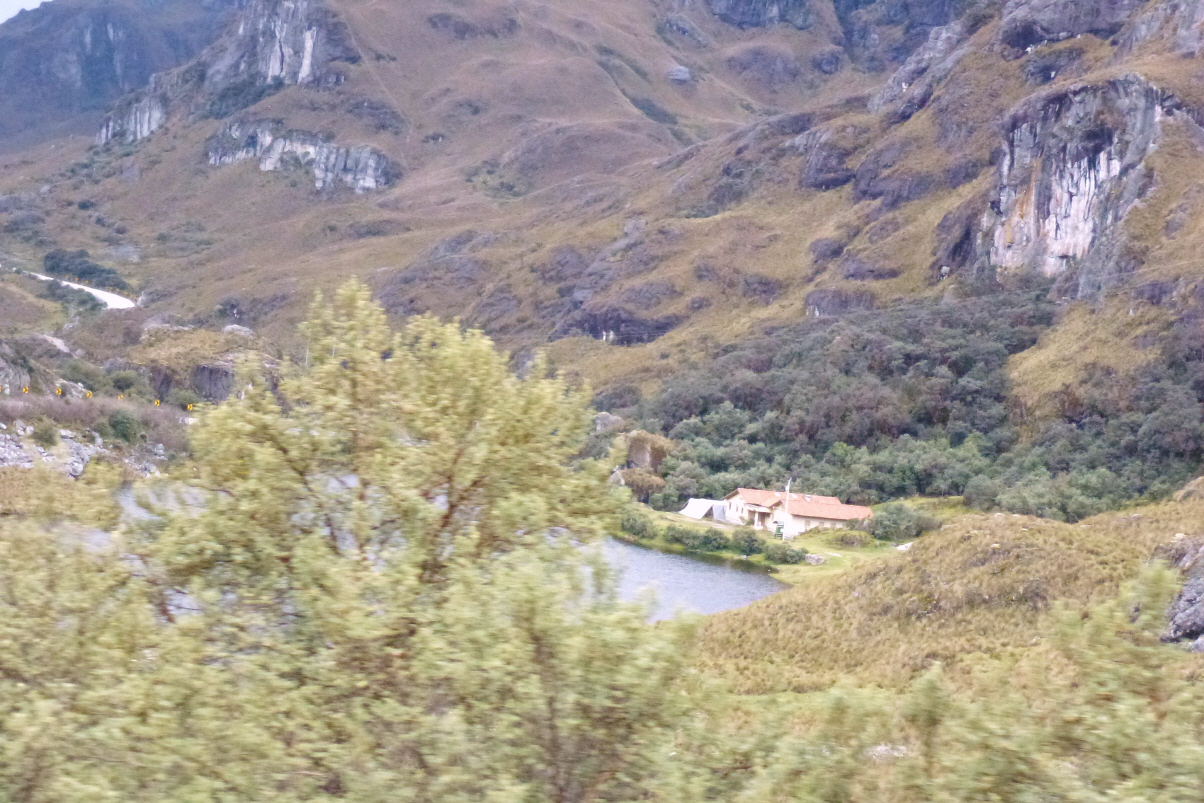 Luftdruck des Reifen kontrollieren und Druck auf 6,2 Atü reduzieren. Die Klimaspezialisten müssen nochmals kommen und innert zwei Stunden funktioniert alles einigermassen. Verabschieden uns und fahren nach ‚Punto Inca‘, dann über einen Pass von 4200 m Höhe nach ‚Cuenca‘. Es regnet stark und ist neblig. 30 km vom Meer sind wir bereits im Urwald. Im Nationalpark ‚Caja‘ gibt es über 200 kleine Seen. Überall werden Forellen verkauft – wir haben leider schon gegessen. In ‚Cuenca‘ suchen wir die ‚Cabanas Yanuncay‘. Haben lediglich die Koordinaten. Nach einigem herumirren und fragen finden wir dieses grosse, schräge und sumpfige Gelände. Der Besitzer spricht etwas Deutsch (war in Bern). Von hier in die Altstadt soll es nur 20 Minuten zu Fuss sein. Flüchten wieder einmal vor den Mücken ins Wageninnere.