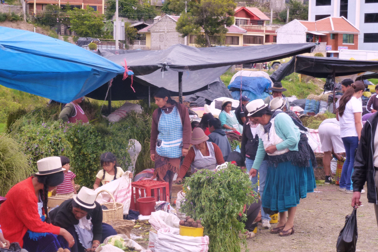 In ‚Alausi‘ ist Sonntagsmarkt. Zuerst suchen wir den Bahnhof, um die Tickets für die Zugfahrt ‚Alausi – Sibambe‘ um 11 Uhr zu kaufen. Gehen noch auf den Gemüsemarkt. Es herrscht ein buntes Treiben.
