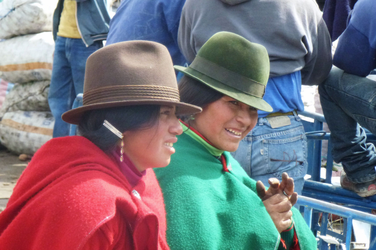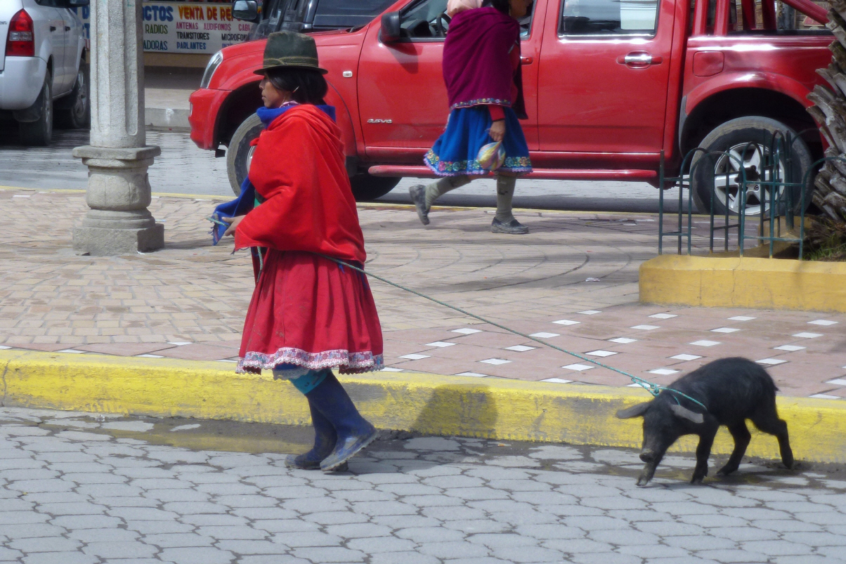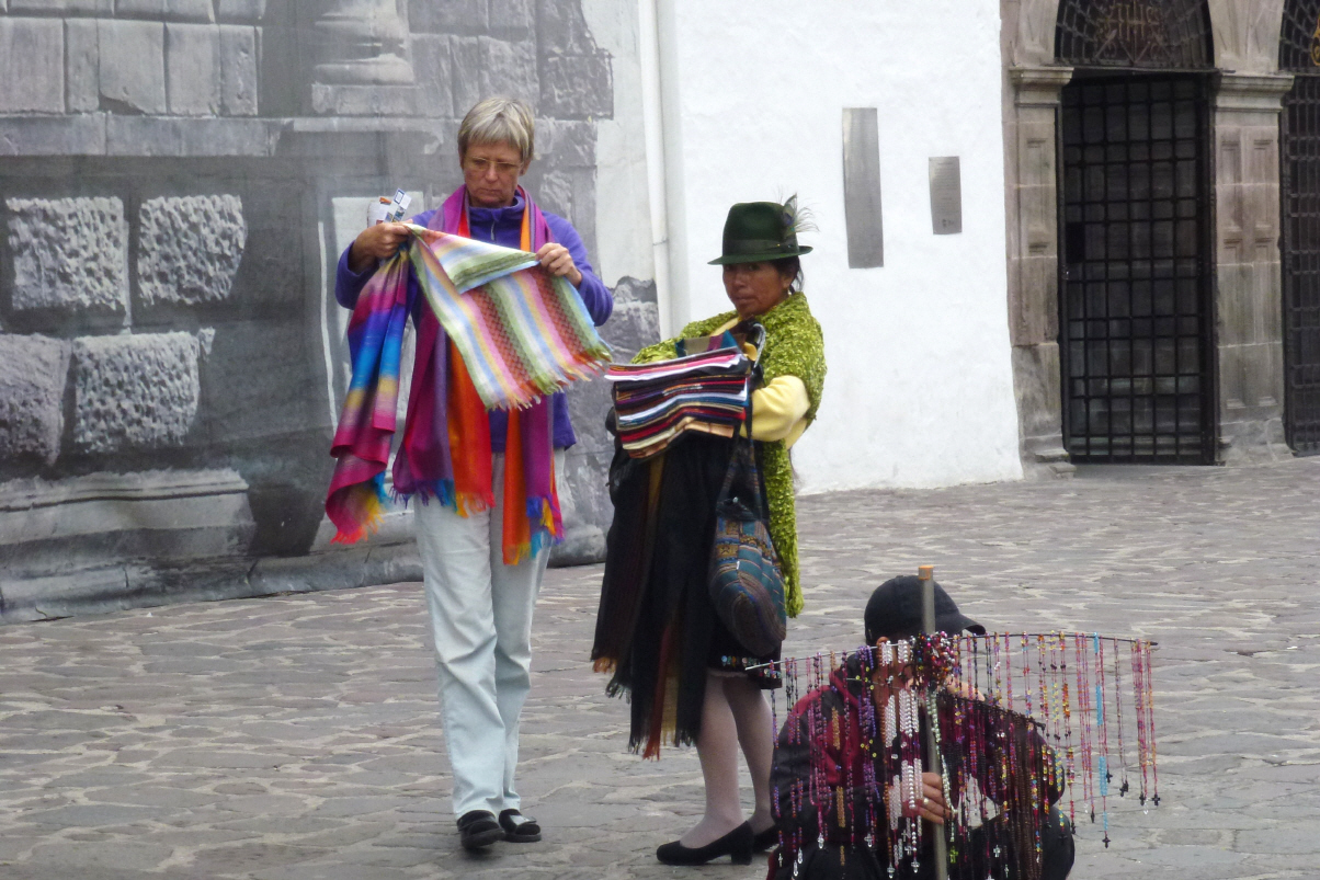 Verabreden uns mit Monika und Wolfgang am 15. Februar um 10 Uhr beim Hotel Hilton in ‚Quito‘. Wir wollen zusammen ins Reisebüro gehen und hoffen, dass die vier Schiffs-Plätze für die Galapagos Inseln noch verfügbar sind. Kurze Strecke bis ‚Azorgues‘. Hier soll ein spezieller Samstagsmarkt stattfinden, wo Panamahüte erhältlich sein sollen. Es gibt zwei Märkte in diesem Ort. Besuchen Beide, aber es gibt nur Obst und Gemüse. Auch stehen viele Frauen mit grossen Mehlsäcken da und verkaufen: Hasen, Hühner, Meerschweinchen, Gänse, Küken, kleine Hunde und Katzen.