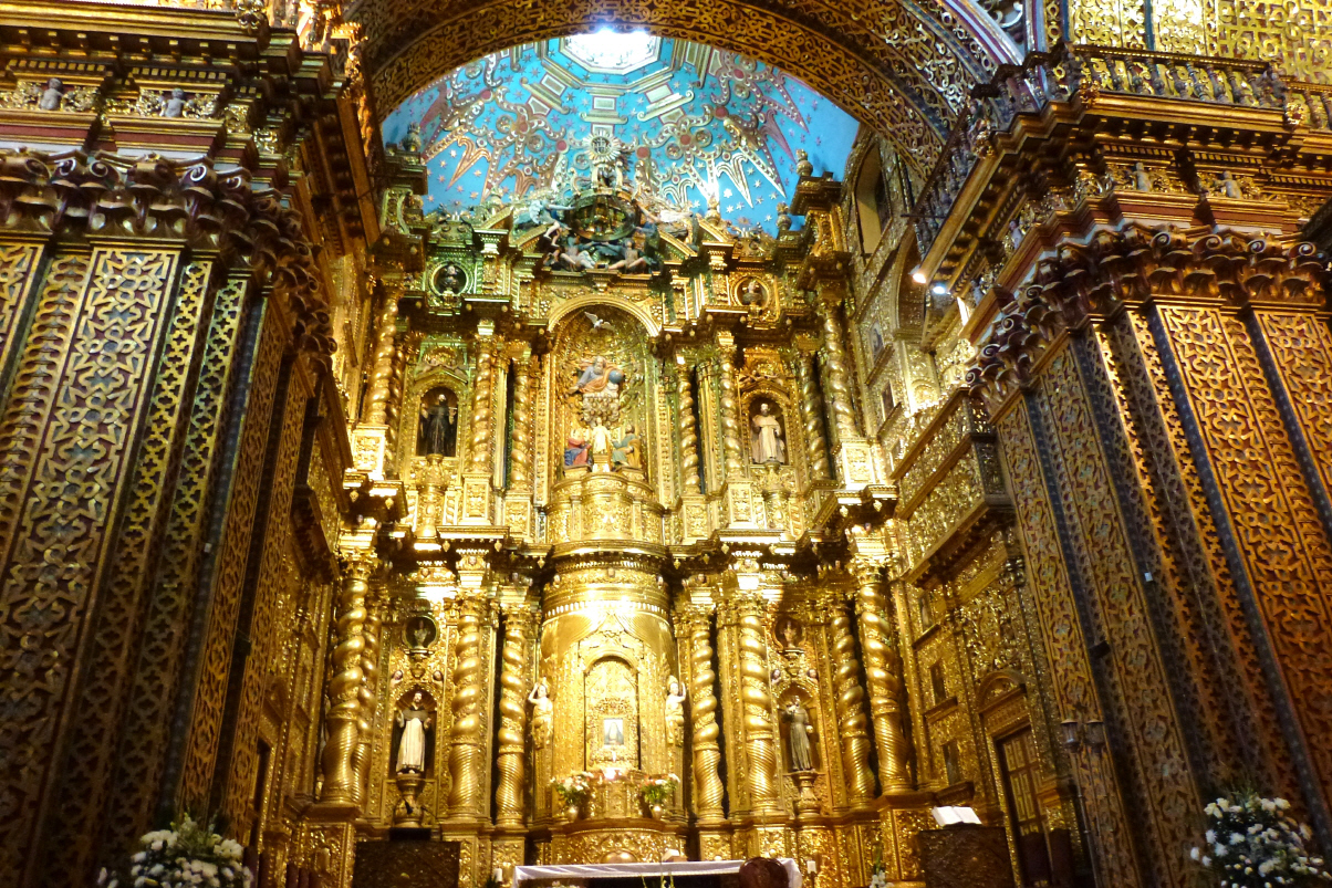 Besichtigen die Kathedrale und nachher das Highlight von Quito, die Kirche ‚la Companio‘. Diese Kirche beeindruckt durch viel, viel Gold. 7,7 Tonnen sollen hier bei der Renovation nach dem Erdbeben 1986 verbaut worden sein.