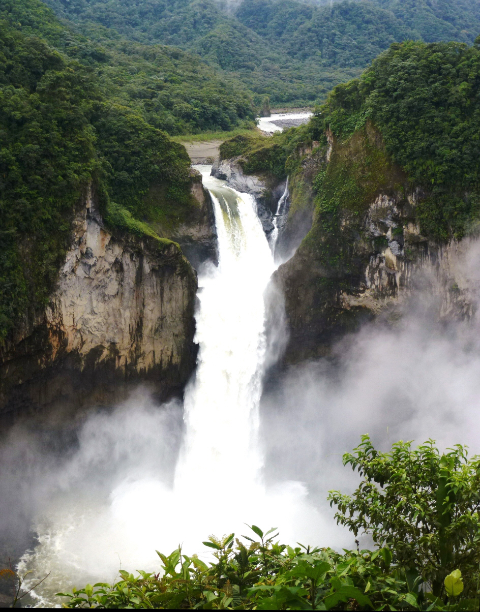 Nach dem Bereitstellen des MAN verabschieden wir uns von Monika und Wolfgang. Wir hatten eine gute Zeit zusammen, aber voraussichtlich treffen wir uns nicht mehr. Denn wir wollen schneller in ‚Cartagena‘ in Kolumbien sein. Sie aber haben noch jede Menge Zeit. Uns zieht es noch einmal in den Amazonas. In Ecuador heisst die Region ‚Amazonien‘. Die Fahrt aus der Grossstadt heraus ist etwas stressig mit kleinem Ehekrach. Zuerst will Kaspar nicht auf die uns bekannte Strasse abbiegen, da ein LKW-Verbot für den Tunnel ist. Bigi sagt aber, dass wir ja vor einer Woche hier ohne Probleme durchgekommen sind. Also grossen Kreis fahren und von der anderen Seite durchs kleine Tunnel (ohne LKW-Verbotsschild!) in den grossen Tunnel. An der Zahlstelle nach dem grossen Tunnel werden wir prompt von einem Security-Beamten gestoppt: LKW-Verbot im Tunnel! Mit dem Handy macht er ein Foto des Nummernschildes und avisiert die Polizei. Wir erklären: ‚sind ein Wohnmobil, kein Camion‘. Dies gilt aber anscheinend hier nicht. Auf unserer gefahrenen Route war kein LKW-Verbot. Wir stellen uns dumm, dümmer am dümmsten. Bigi versucht nicht zu fliessend Spanisch zu sprechen. Die Zeit vergeht und das Blatt wendet sich: er zeigt uns den Weg und wir dürfen weiter fahren ohne einen Cent bezahlen zu müssen. Wie schon öfters in Südamerika: Paciencia (Geduld)! Mit noch ein paarmal wenden finden wir endlich die richtige Strasse ‚E28‘ nach ‚Pilo‘ und ‚Papallache‘ (Thermen). Da heute Sonntag ist verzichten wir auf ein Bad in den Thermen mit den vielen Leuten. Fahren weiter nach ‚Baeza‘, links in den Nationalpark’ Cayambe-Coca‘ zum grössten Wasserfall ‚San Raphael‘. Ein Kaskadenwasserfall von 150 m Höhe und 40 m Breite.
