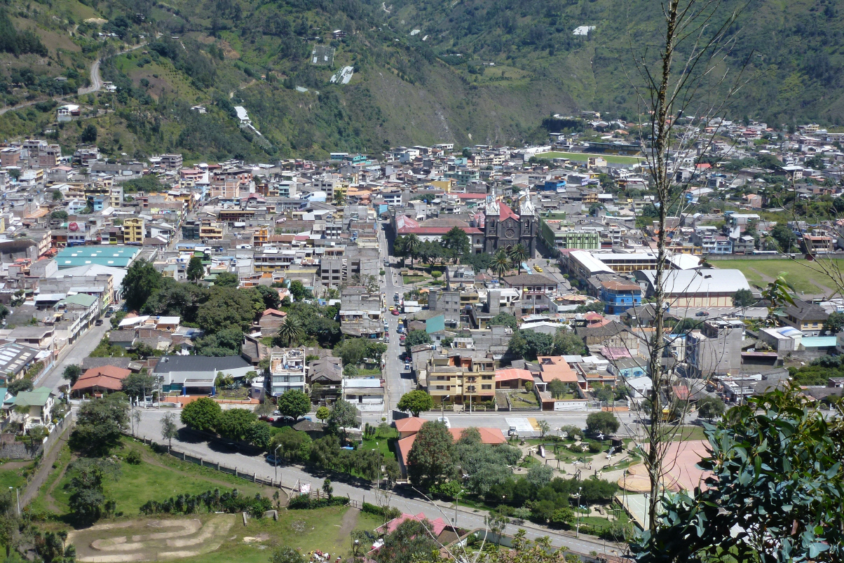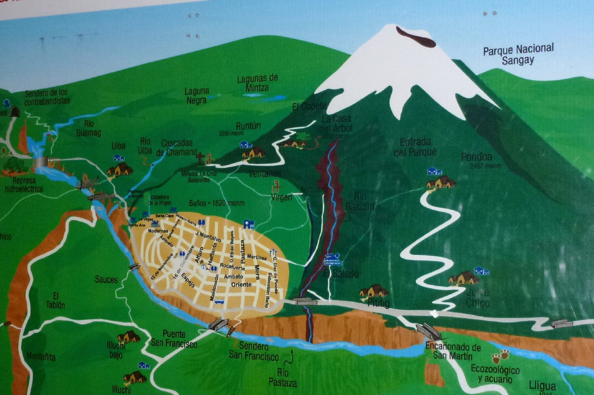 Am späteren Nachmittag fahren wir via ‚Riobamba‘ nach ‚Banos‘, einem Touristen- und Wallfahrtsort am Fuss des noch immer speienden Vulkans ‚Tungurahu‘ (5023 m). Der Vulkan brach letztmals 1999 aus und begrub den Ort unter einer Aschewolke. Der Ort wurde evakuiert, Soldaten kamen und plünderten. Diie Bevölkerung setzte sich zur Wehr und eroberte ‚Banos‘ friedlich zurück.. Im Reiseführer sind viele gute Restaurants empfohlen. Gehen zum Italiener Pizza essen. Wieder einmal ein Abend mit touristischem Ambiente!