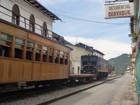 Von weit her kommen die Bauern um zu verkaufen und natürlich auch einzukaufen. Zurück zum Bahnhof, Pass und Tickets registrieren lassen und in den schön restaurierten Eisenbahnwagen einsteigen. Die Fahrt über die Teufelsnase dauert 35 Minuten, dann eine Stunde Aufenthalt in ‚Sibambe‘. Es tanzt eine Gruppe Einheimischer und es gibt Gelegenheit, Souvenirs vom Dorf einzukaufen - ‚fair trade‘ Tee. Nachher wieder mit dem Zug zurück nach ‚Alausi‘. Der Zug überwindet in 15 km einen Höhenunterschied von 500 Metern. Um dies erreichen zu können, haben die Ingenieure einen Trick angewandt: Die Bahn überwindet eine Höhe und fährt dann auf ein Stumpengeleise; hier wird die Weiche für die nächste Steigung gestellt, und weiter geht es rückwärts hinauf resp. hinunter und dies drei Mal. Der Name ‚Teufelsnase‘, weil hier 1200 Jamaicaner beim Bau der Bahn durch Gelbfieber, Malaria und Unfälle umgekommen sind. Ein technisches Meisterwerk: Baubeginn 1850, Einweihung der Teilstrecke 1908, Fertigstellung bis ‚Quito‘ erst 1960! Seit ein paar Jahren ist die Bahnstrecke von ‚Guayaquil‘ nach ‚Quito‘ wegen eines Erdrutsches unterbrochen. Soll bis 1. Dezmber 2012 wieder vollständig in Ordnung gestellt sein.