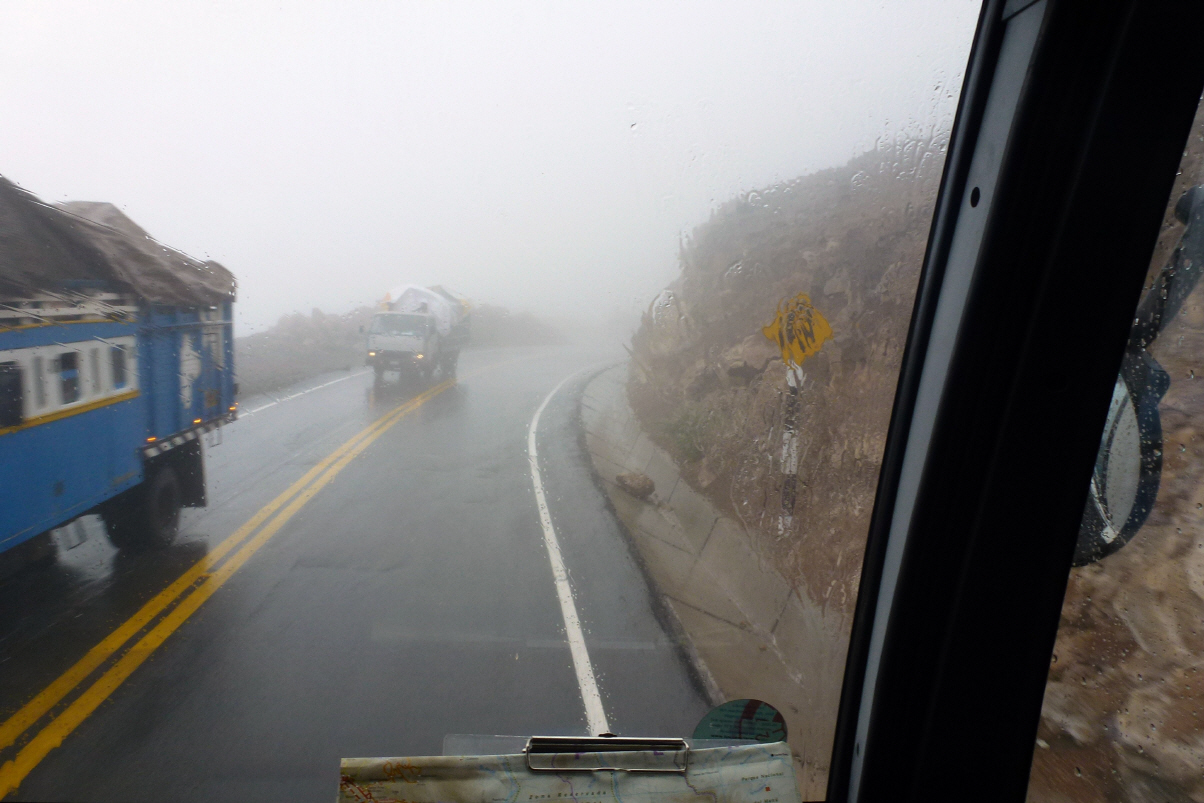 Brechen früh auf, denn wir haben heute eine lange Strecke von über 300 km und zwei Pässe von 4500 m Höhe zu bewältigen. Das Wetter ist schlecht. Die Strasse steigt mit vielen Kurven steil an. Auf 4000 m fängt es an zu regnen und der Nebel bereitet uns grossen Stress. Die Sichtweite ist manchmal nur 20 - 50 m! Zum Glück hat es wenig Gegenverkehr. Sobald uns aber Bus oder LKW kreuzen, wird es gefährlich, denn diese kommen meistens über die Mittellinie. Wir Zwei haben alles im Griff und fahren sorgfältig. Der Co-Pilot gibt per Navigationssystem Anweisung, wann die nächste Kurve kommt und wie stark diese ist. Dies hilft klar und macht auch noch Spass. Zusammengefasst: wir sind um 08.30 Uhr losgefahren, 45 Minuten Mittagshalt, zwei Mal WC-Stopp in der Pampas und um 17.30 Uhr Ankunft in ‚Nazca‘ – Fahrzeit für ca. 300 km 9 Stunden, Durchschnittstempo 30 km/h!