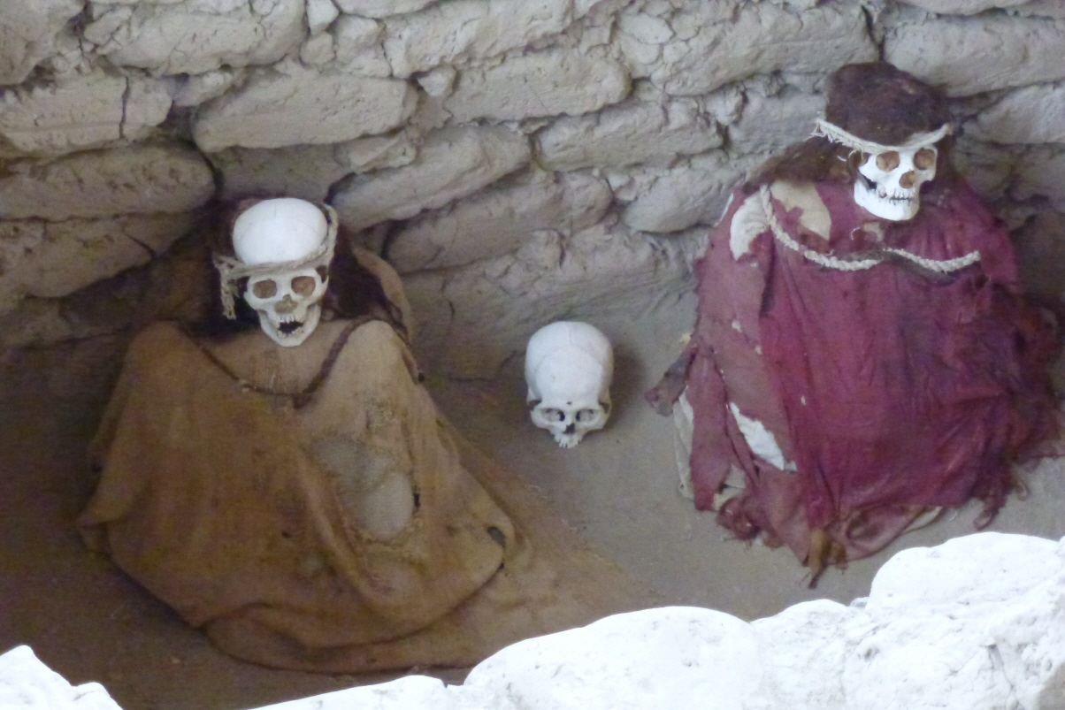 27 km ausserhalb von ‚Nazca‘ befindet sich der ‚Pre-Inka Friedhof Chauchilla‘. Dorthin fahren wir. Besuchen die etwas makabren Gräber mit den sitzenden Mumien, einer ähnelt Gaddafi. Beschliessen hier zu übernachten. Hoffen, dass uns die Grabräuber nicht ausrauben. Wir sehen immer wieder grosse Kaktusfelder. Inzwischen wissen wir für was. Irgendein kleines Insekt befällt den Kaktus. Diese Tiere werden abgelesen und das Tier wird zu einem natürlichen, roten, gesuchten und teuren Farbstoff verarbeitet.