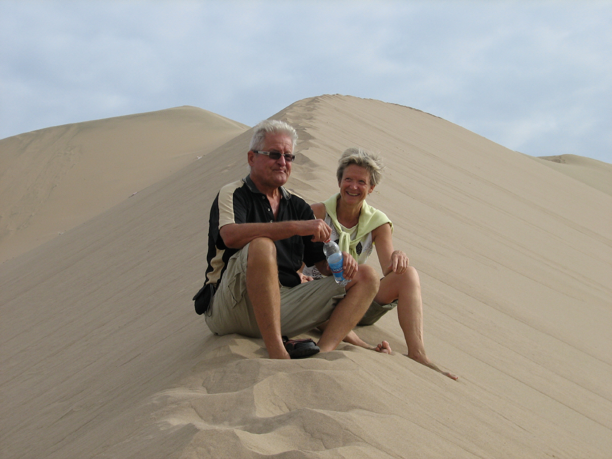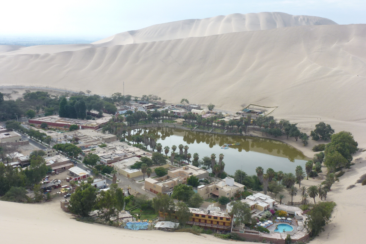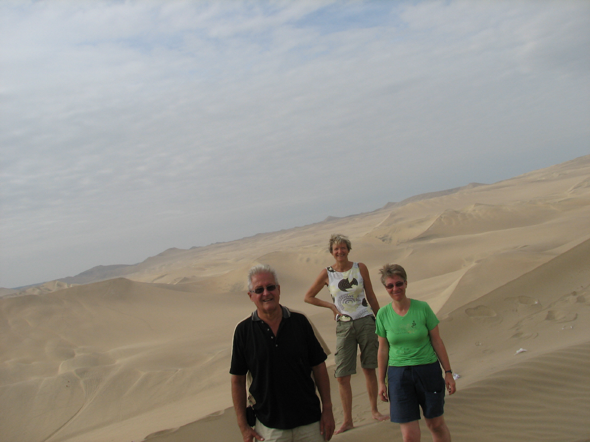 Dann auf die ‚Panamericana‘ Richtung ‚Ica‘. Unterwegs besteigen wir den wackligen Nasca-Aussichtsturm. Von hier sehen wir ‚Baum‘ und ‚Hände‘ sehr gut und nahe im Wüstensand. Auf der Weiterfahrt nur Wüste, ab und zu ein grünes Tal. Es wird Baumwolle, Trauben und Mais angebaut. Von ‚Ica‘ aus zur 6 km entfernten Oase ‚Huacachina‘ mit den grössten Dünen Südamerikas. Es ist eine echte Oase mit kleinem See, Pedalos und Ruderbooten. Der See wird gesäumt von Palmen und einer Uferpromenade mit Restaurants. Die Dünen sind 150 - 200 m hoch und sehen sehr steil aus. Leute steigen hinauf und Sandboardfahrer kurven/rutschen hinunter. Spezielle Sandbuggys werben um Kunden um mit Ihnen eine Fahrt in die Wüste zu machen. Haben heute ‚kein Bock‘ um bei dieser Hitze die Dünen zu besteigen. Wie heisst es doch so schön in Südamerika: manana. Lieber einen ‚Pisco Sour‘ auf der Terrasse und später ein gutes Abendessen in einer ‚Gourmet‘ Kneipe.
