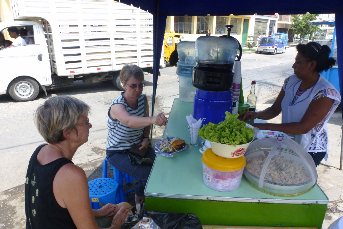 An der Hauptstrasse geht Bigi zu den Telefonkabinen um mit der Familie zu plaudern. Dann in ein Touristenrestaurant ‚Ceviche mixto‘ essen. Kaspars Kommentar: ‚Schmeckt nach vielen Zwiebeln und Fisch.‘ Zur Orientierung, es handelt sich auch um gemischten rohen Fisch, Meeresfrüchte und Zwiebeln, dazu Maiskörner, Maniok und Süsskartoffeln. Nun freuen wir uns auf den Pool im Hotelgarten.