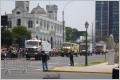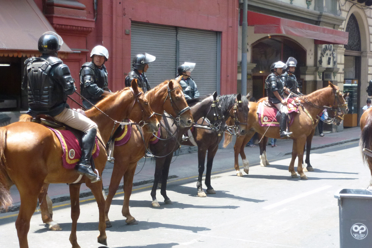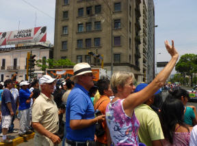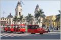 Mit dem Taxi im peruanischen Fahrstil zur ‚Plaza des Armas‘ bei der Kathedrale von Lima. Die fahren wie verrückt, links, rechts, dazwischen, Millimeterarbeit, aber zu unserem Erstaunen streifen sie die andern nie. 40 Minuten in diesem Fahrstil reichen! Am Hauptplatz steht überall viel Polizei mit Helmen und Schutzschildern. Sogar berittene Polizei und Gitter versperren die Strassen. Es protestieren die Amazonas-Indianer mit nacktem Oberkörper und Pfeil und Bogen für eine eigene Universität, sowie die Taxifahrer für ihre angestammten Rechte, überall jederzeit am Strassenrand halten zu dürfen. Dies ist jedoch für den Verkehrsfluss nicht gerade förderlich.