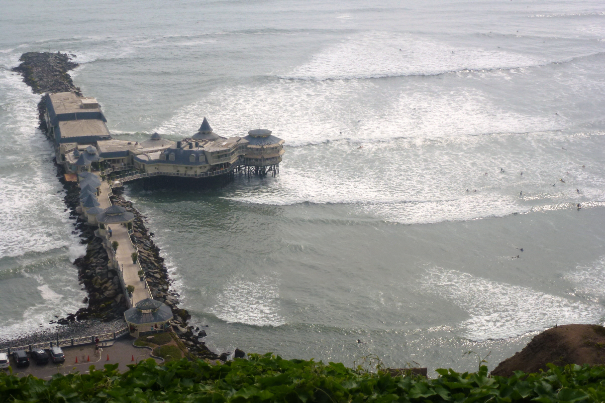 Vor dem Eindunkeln spazieren wir die zwei Block zur ‚Costa Verde‘ und die 340 Treppenstufen runter zum Meer – und später mit Pisco Sour wieder hinauf. Im Restaurant ‚Rosa Nautica‘ (eine Art Seebrücke) geniessen wir den Pisco. Das Abschiedsessen mit Regula (Erlös der Checks) ist bei uns gleich um die Ecke im noblen Restaurant ‚Brujas de Cachiche‚ am ‚Plaza Bolognesi‘. Hier verkehrt ‚ganz‘ Lima resp. die obersten Zehntausend.