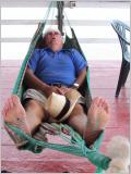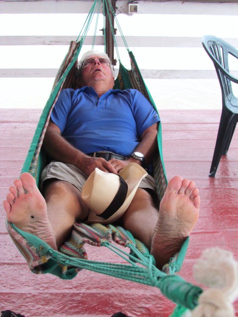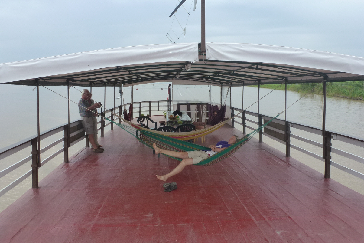 Trotz der harten Matratze einigermassen gut geschlafen. Toilette und Dusche in einem der zwei Badezimmer. Frühstück mit Spiegeleiern und Gummi-Toast. Sitzen und liegen in den Hängematten auf dem Oberdeck und lassen das Ufer des Amazonas an uns vorbei ziehen.