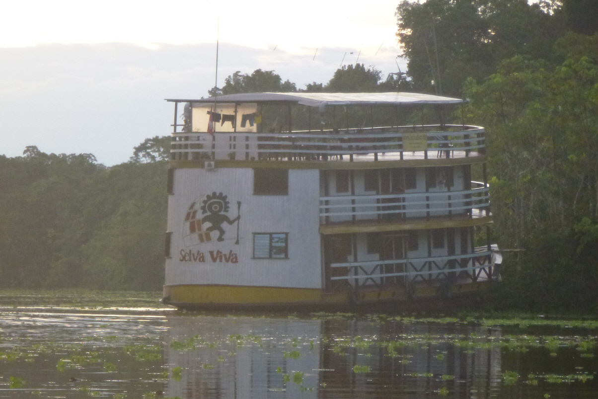 Das Schiff gehört einer Nonprofitorganisation mit Sitz in Peru, welche den Menschen in den abgelegenen Dörfern ärztliche Hilfe und Schulung in Heilpflanzen anbietet. Das Schiff kann aber auch von Touristen gemietet werden, was eine gute Einnahmequelle ist. Unsere Kabine ist ganz vorne im Bug. Ein Bett, in den Ecken ein Büchergestell, vier Wandhacken, ein Spiegel und zwei Schemel mit Schwimmwesten darunter.