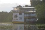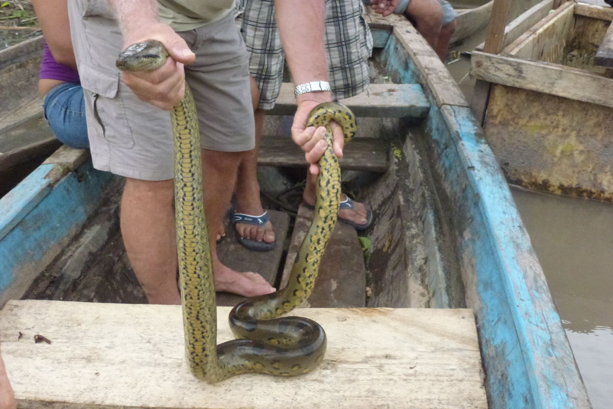 Eigentlich müssten wir heute hungrig ins Bett, denn wir vier sind keine guten Fischer. Zurück auf dem See sehen wir die Seerose ‚Viktoria‘. Riesengross: Pflanzenteller bis 1,4 m Durchmesser und einem Rand von ca. 8 cm. Die Blüte ist aussen weiss und innen rubinrot. Zurück beim Schiff gibt es ein recht gutes Nachtessen. Serge will mit uns eine stündige Nachtwanderung machen. Es soll grosse Spinnen, Ameisen, Schlangen und sonstiges Getier zu bewundern sein. Kaspar verzichtet freiwillig, was Bigi mehr als gelegen kommt. Im Nachhinein entpuppt sich dies als gute Entscheidung. Ob man es glaubt oder nicht, hier im Dschungel gibt es eine Diskothek mit sehr lauter Musik. Da diese bis 22 Uhr nicht aufhört, disloziert unser Schiff zu einem ruhigeren Ankerplatz. Aber zuerst muss das Schiff aus dem Sand raus, was eine Weile dauert. Die Bum-Bum-Musik hören wir noch die ganze Nacht.