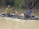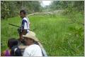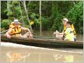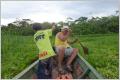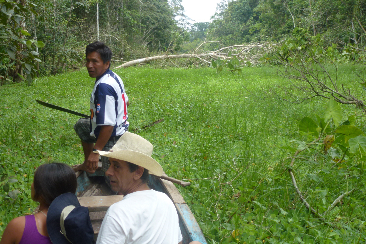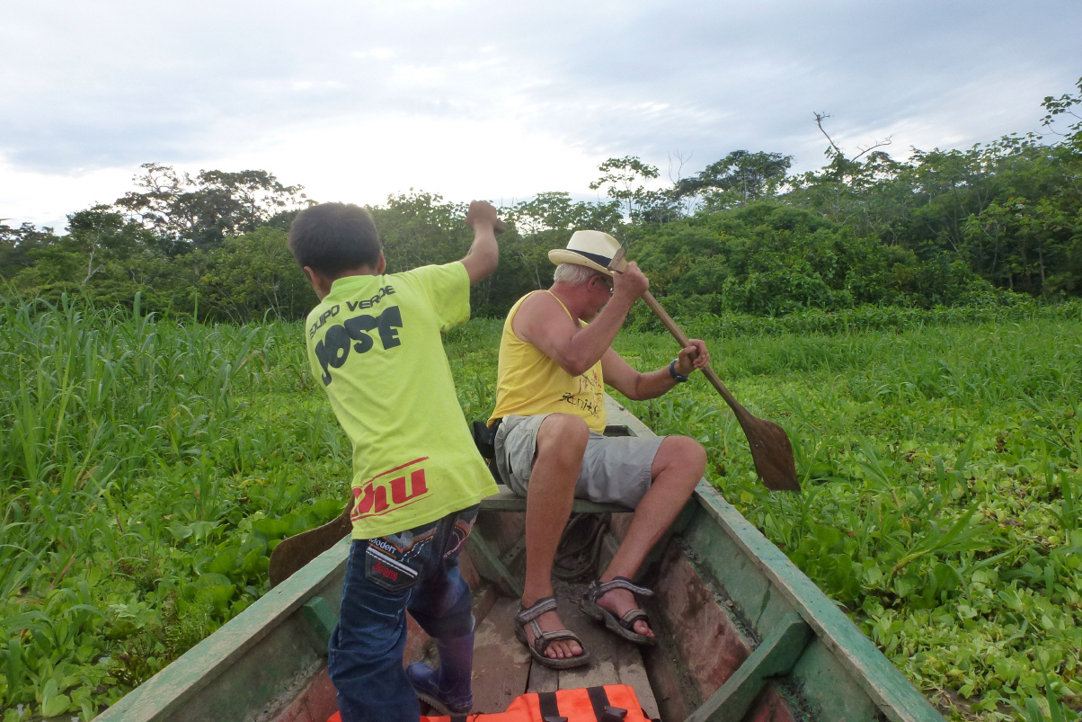 Durch immer dichter werdenden Urwald und kleine Flussläufe. Sie sind mit Pflanzen bedeckt und sehen aus wie ein Rasen. Wir pflügen die Pflanzen beiseite. Einmal versperrt ein umgefallener Baum den Fluss, also in den Wald hinein, Machete wird gezogen und die Fahrrinne frei gehackt.
