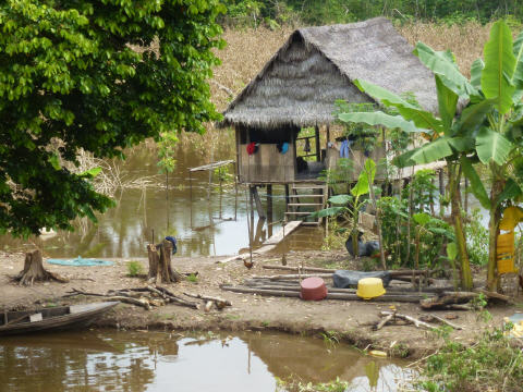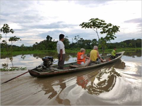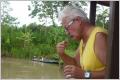 Die Mücken geniessen Kaspars Blut. Er hat vergessen sich gegen Mücken einzuschmieren. Auch Monikas Beine werden gelöchert. Die Freude hält sich heute in engen Grenzen. Bei einem unter Wasser stehen Steg, nicht weit vom nächsten Dorf entfernt, beschliessen wir umzukehren. Es reicht! Zurück zum Schiff und weiter flussaufwärts. Der Fluss heisst ‚Ucagali‘. Alle riesigen 30 - 40 m hohen Edelbäume wurden bereits vor langer Zeit gefällt. Hier sind nur noch 30 m Bäume zu finden. Für die Nacht machen wir Halt im kleinen Dorf ‚San Jose Toma Agua Pura‘. Nach der Dorfbesichtigung geht es mit einem Langboot und dem Dorfchef in den Urwald. Es soll eine Stelle geben, wo man im kleinen Fluss baden kann.