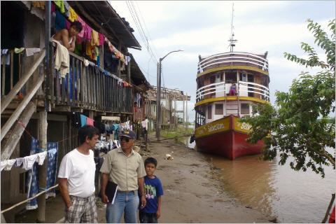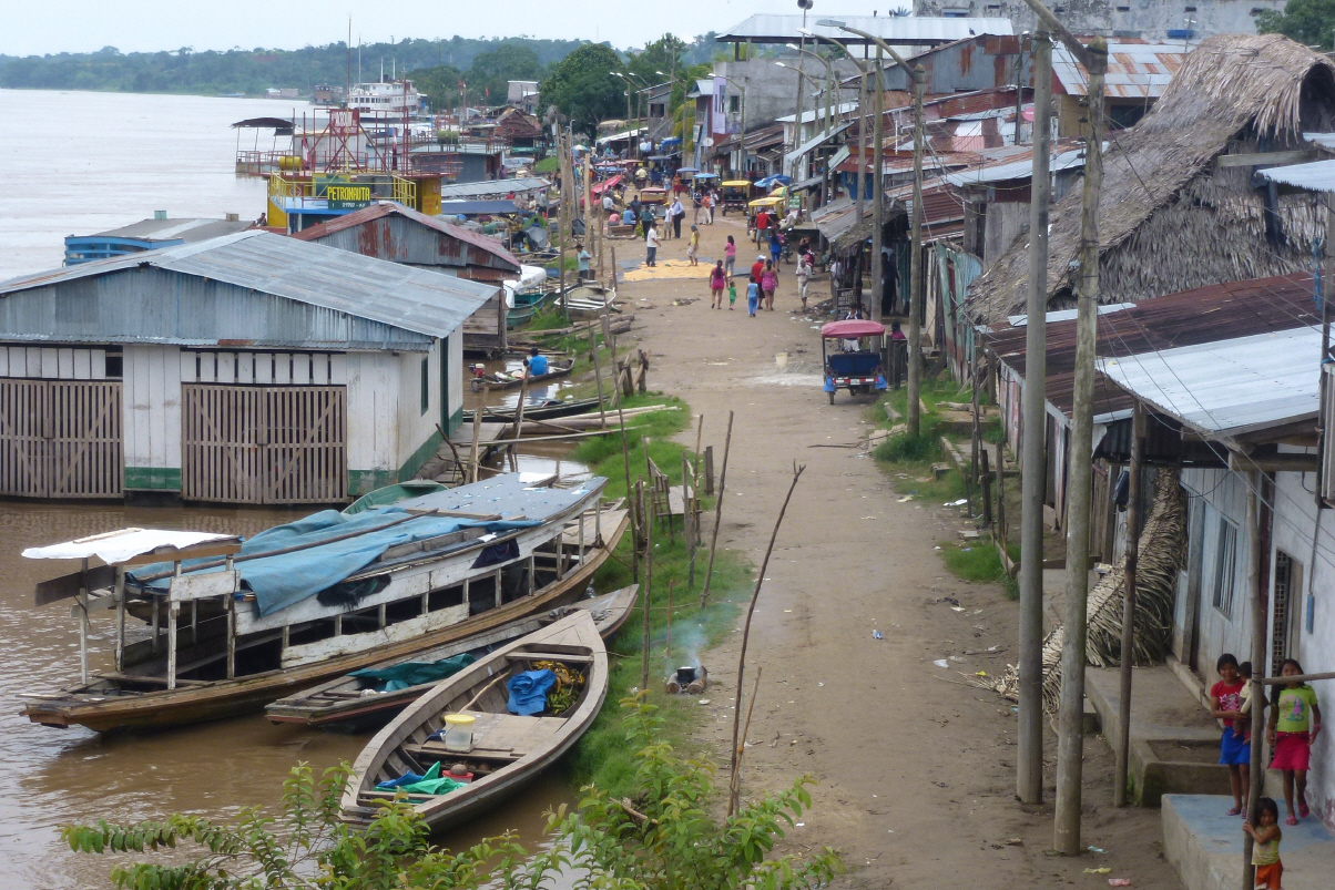 Mit der Boing 737 der ‚Peruvian Airline‘ von Lima nach ‚Iquitos‘ an den Amazonas. Der Flug über die Anden ist angenehm, die Landung jedoch etwas ruppig. Mit dem Taxi zum Hafen. Die Stadt ist verstopft mit den unzähligen Dreirad-Taxis. Die Busse haben einen Holzaufbau, seitlich keine Scheiben und überall schauen die Ellbogen der Leute ins Freie.