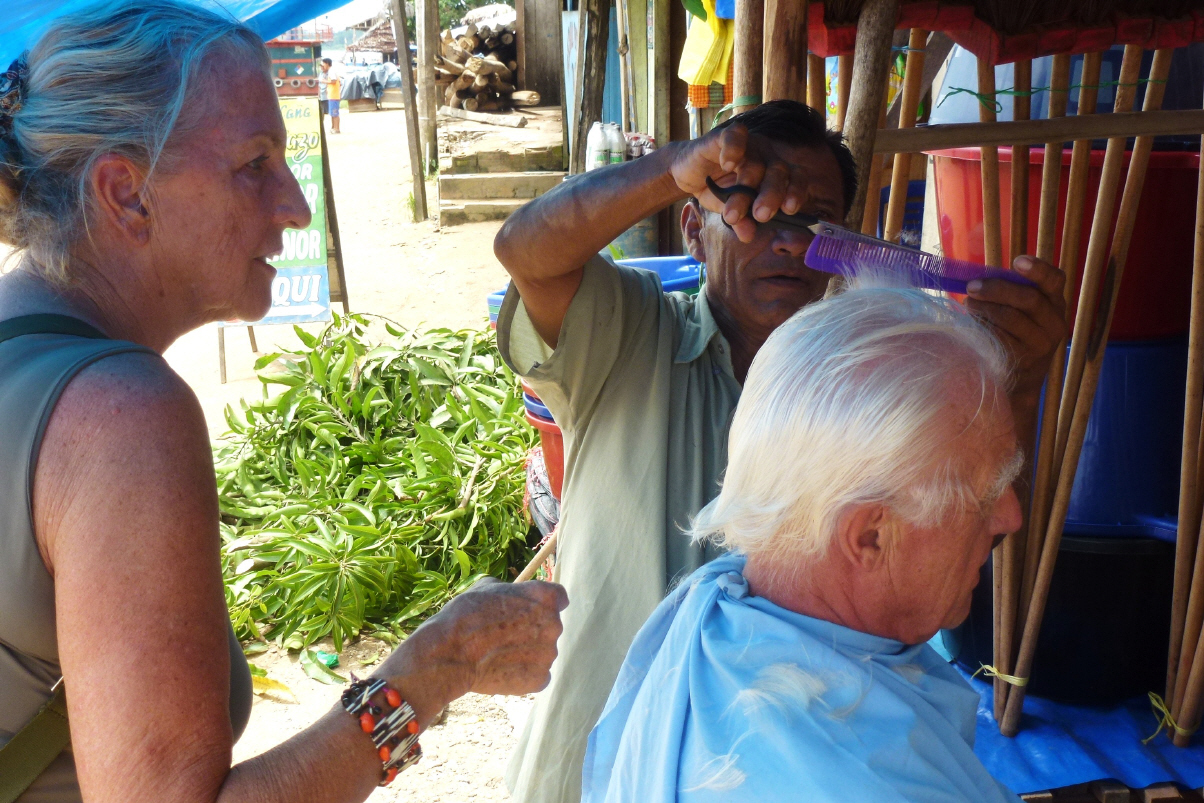 Wolfgang geht zum einheimischen Coiffeur. Nach dem Mittagessen mit dem Taxi 100 km nach ‚Iquitos‘. Kurze Stadtbesichtigung. Ein richtiger Tropenregen setzt ein – wir hatten Glück, denn unterwegs hat es nur beim Mittagessen einmal kurz geregnet. Wir sind ja in der Regenzeit und es regnet sonst jeden Tag so mindestens einmal richtig stark.