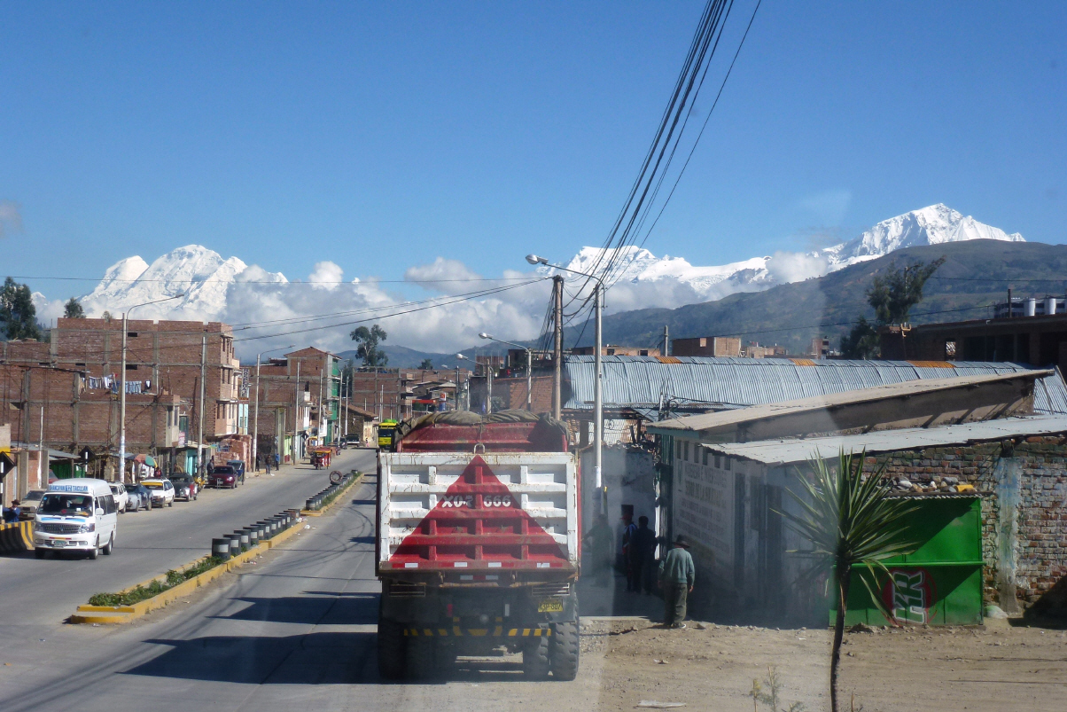 Weiterfahrt nach ‚Huarez‘. Hier ist die Bergsteiger-Metropole Perus. Von Mai bis Juni soll Hochsaison sein und Bergsteiger und Kletterer aus aller Welt kommen hier hin. Es gibt Klettertouren und bis zu zweiwöchige Wandertouren um den höchsten Berg Perus ‚Huascaran‘ (6768 m). Seit 1977 werden in Zusammenarbeit mit Schweizer Bergführern werden hier peruanische Bergführer ausgebildet und die Outdoor-Bekleidungsfirma ‚Mammut‘ ist Sponsor. Die Stadt gefällt uns nicht. Erkundigen uns beim Touristenbüro am Hauptplatz und fahren zu den Thermalbädern von ‚Monterrey‘. Diese liegen steil am Hang und hier ist nichts mit schlafen. Mit Mühe wendet Kaspar den MAN und parkiert an der steilabfallenden Strasse. Badehosen anziehen und ab ins Bad. Der Pool ist voll mit Einheimischen und das Wasser ist braun, eigentlich eine Brühe. Wir haben schon nach kurzer Zeit genug, denn das Wasser ist nur leicht warm. Nebenan auf einer Wiese steht ein Unimog aus Deutschland. Ingrid und Jörg kommen zu uns auf einen Kaffee. Wie immer werden Reiseinformationen ausgetauscht und sie geben uns eine gute Adresse für die Verschiffung Kolumbien-Panama. Wer fährt denn da draussen vorbei?! Monika und Wolfgang. Die Einfahrt zur Wiese ist für Wolfgang und uns nicht geeignet und so fahren wir zusammen durch die Stadt und 20 km weiter zum Flussbett, wo wir ruhig übernachten.