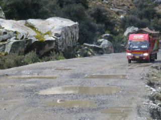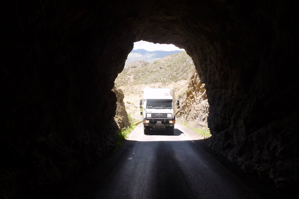 Das erste Tunnel – Breite ca. 3m, Höhe 6 m - nimmt uns bereits den ‚Mumm‘. Das Verflixte sind die Felsen, welche seitlich ins Tunnel rein ragen. Dies ist ziemlich problematisch, falls unser MAN schaukelt. Haben wir ja in Arequipa erlebt!