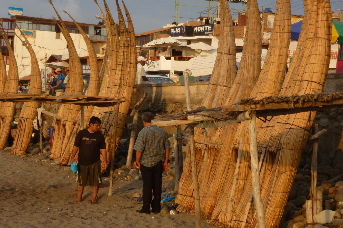 Parkieren daher am Strand. Spazieren der ‚Promenade‘ entlang ins Dorf. Hier gibt’s spezielle Fischerboote aus Schilf zu bewundern. Kurz auf die Seebrücke und dann zum Nachtessen. Wolfgang und Monika spazieren vorbei. Zwei freundliche Polizisten möchten, dass wir näher beim Dorf parkieren, da es dort sicherer und bewacht sei.