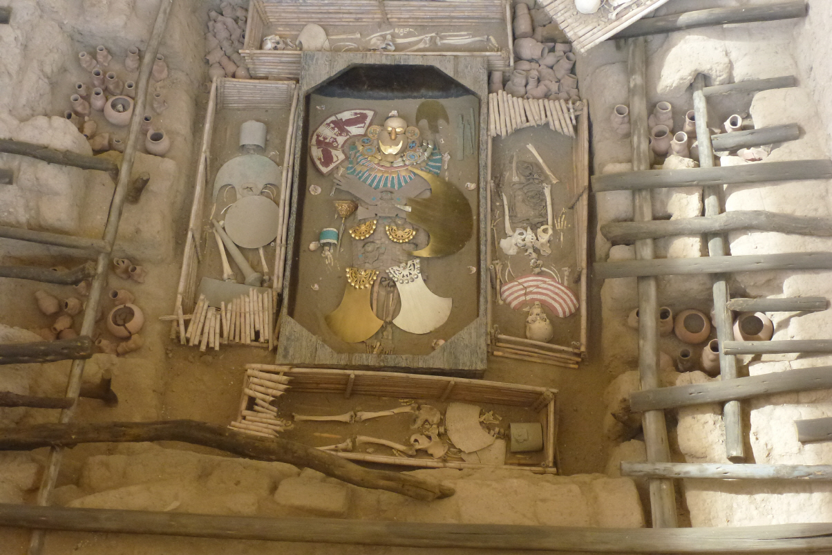 Weiter nach ‚Lambayeque‘ ins ‚Museo tumba reales de Sipan‘. Hier muss Kaspar den Fotoapparat abgeben. Auf drei Stockwerken besichtigen wir die rekonstruierten Gräber und in Vitrinen ist der Originalschmuck ausgestellt. Sehr gute Ausstellung, leider nur in Spanisch und für einen Führer ist unser Interesse zu gering. Es wird recht anschaulich gezeigt, wie die ‚Moches‘ im achten Jahrhundert gelebt haben.