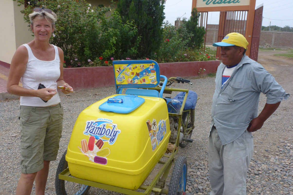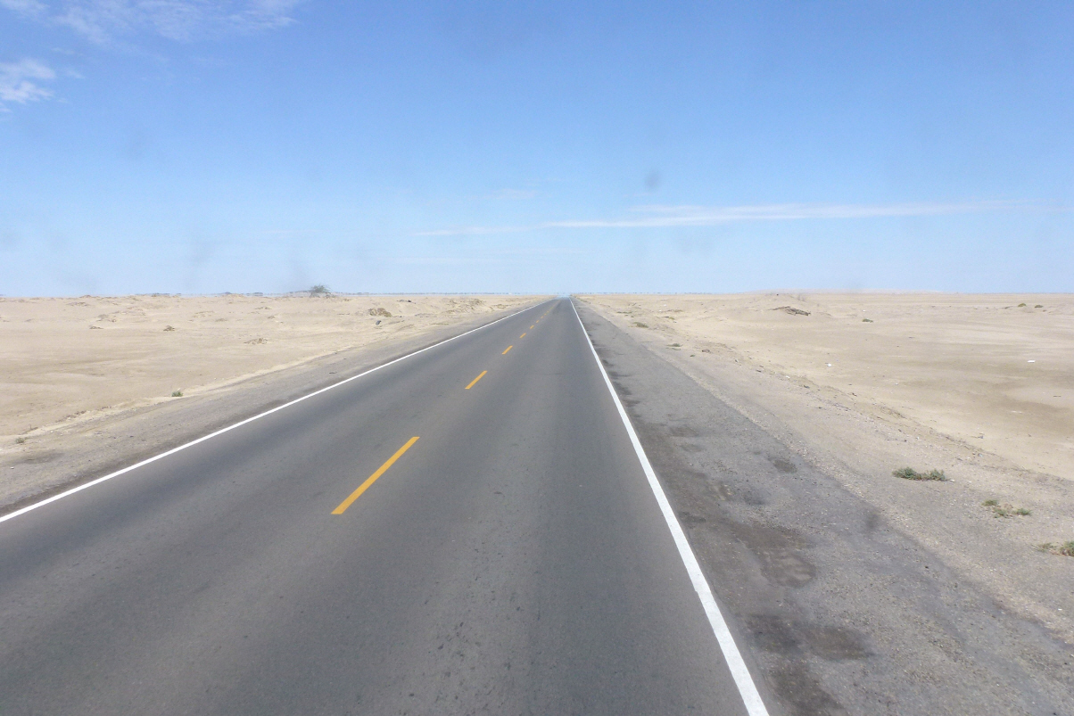 Bis zum Pazifik sind es nur noch 40 km. Auf der ‚Panamericana‘ nach der Öl- und Fischer-Stadt ‚Chimbote‘ und weiter bis ‚Trujillo‘. Es hat viele riesige, fruchtbare Felder mit Mais, Zuckerrohr und grünen Spargeln. Sehen auch grosse Hühnerställe mit sicher bis zu 100‘000 Hühnern. Fahren quer durch ‚Trujillo‘ (nur 1 Mio. Einwohner) um zu sehen, ob sich eine kurze Tour durch die Stadt lohnt. An einer Ecke, gleich bei einem Strassenmarkt ist Schluss: tief hängende Elektrodrähte über die Strasse. Nur mit Hilfe eines Marktfahrers und seinem Besen können wir unter den Drähten durchfahren.