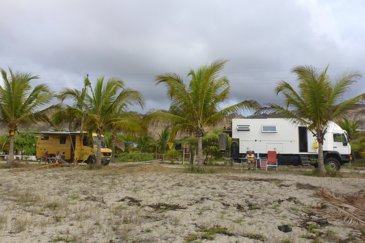 In der Nacht hat es zum Teil stark geregnet. Wir haben gedacht, hier in dieser Wüstenregion regnet es fast nie. Wir haben also das ‚fast nie‘ erlebt. Morgenbad im Pazifik, herrlich! Unsere Camper stehen auf neu aufgeschüttetem, lehmigem Boden. Wolfgang befürchtet hier nicht raus zu kommen, was sich bewahrheitet. Nach 20 m sitzt er hinten rechts mit durchdrehenden Rädern fest. Unser MAN kommt mit allen Sperren und ein wenig Mühe heraus aus dem Morast. Hier sind die Reifen ausschlaggebend. Auch unsere Reifen sind hier schlecht. Wolfgang hat ein wirklich gutes und langes Abschleppseil dabei. Montieren und dann zieht der MAN den 5,5 Tonnen schweren gelben Mercedes ohne Probleme aus dem Sumpf auf die Strasse. Die ganze Aktion dauerte vielleicht eine halbe Stunde. Die Frauen stehen auf der Strasse und halten den Verkehr auf. Ein Peruaner unterstützt sie. Von Ruth und Peter aus der Schweiz haben wir die Koordinaten eines ruhigen Campingplatzes direkt am Meer in ‚Caleta Cruz‘. Fahren mit Navigationssystem und sehen das verblasste Schild, das nicht gerade einladend aussieht. Alt und verrostet. Fragen den Besitzer und siehe da, es entpuppt sich als sauberes und mit Palmen bepflanztes Gelände mit kleinem Hostal. Im Hintergrund tost der Pazifik. Hier kurz vor der Grenze zu Ecuador (50 km) werden wir mal 3 - 4 Tage Ferien machen. Sofort ein Bad im Pazifik und dann am Strand entlang spazieren und sich gleich wieder einmal richtig verbrennen (Kaspar wird und wird nicht gescheiter). Schwatz bei einem ‚Pisco‘ für unseren Abschleppdienst. Geniessen einfach den Tag und abends setzt schon wieder starker Regen ein.