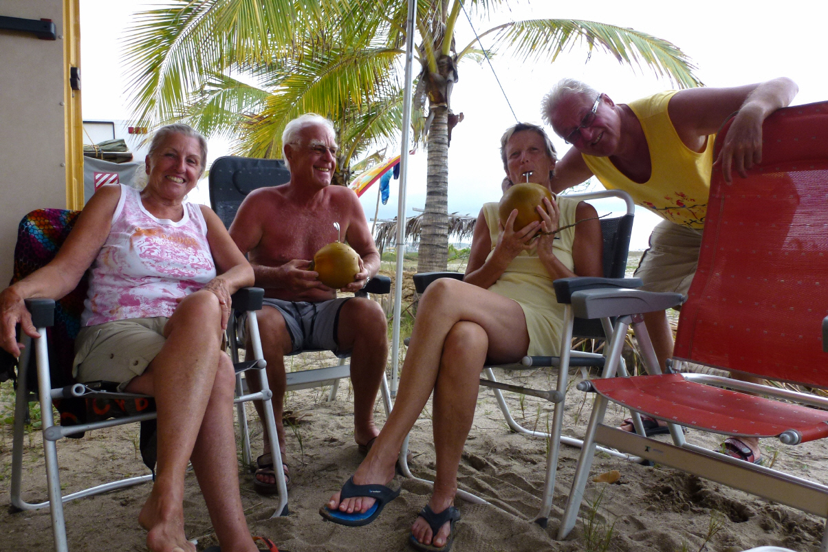 27 C feuchtheiss, bewölkt. Genau richtiges Computerwetter! Mittags dem Strand entlang ins Ort, es wird heiss! Fisch essen und mit dem Dreirad-Taxis zurück für die Siesta. Abends holt Wolfgang frische Kokosnüsse vom Baum. Mmmh!