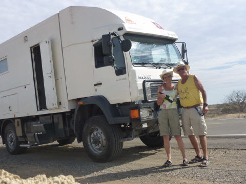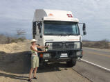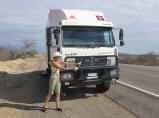 Wasser auffüllen. Verabschieden uns von den Belgiern, die in den Amazonas fahren. Monika und Wolfgang haben die gleiche Route zum Pazifik und dieselben Übernachtungs-Tipps. Auf dem Markt noch Brot einkaufen und dann auf die ‚Panamericana Norte‘ nach Piura, Silluana in die Ölhauptstadt Talara. Viele Ölpumpen fördern den teuren Rohstoff. Zuerst 200 km fast schnurgerade durch die knochentrockene Wüste. Kurz vor unserem Etappenziel ‚Mancora‘ hat der MAN Jubiläum. Der Champagner ist kühl gestellt und das Fest kann steigen!