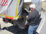Kurz nach dem Erwachen sagt Kaspar: ‚ich iss kei Spaghetti meh vo dir‘. Was er gerade korrigiert: ‚kei scharfi Spaghettisauce meh‘. Die sehr piccanten Spaghetti-Bolognese haben ihn die ganze Nacht geplagt und er konnte nicht schlafen. Wollen 70 km einen Abstecher nach ‚Chavin‘ machen. Dort hat es eine PréInka-Ruine und Thermalbäder. Es geht über einen Pass von 4500 m durch einen Tunnel. Die Strasse ist auf der Karte rot eingezeichnet, also geteerte Hauptstrasse. Die Strasse ist wohl geteert, aber in einem fürchterlichen Zustand. Riesige Löcher reihen sich an riesige, tiefe Löcher, gefüllt mit Wasser. Es schüttelt erbärmlich. Nach 30 km haben wir genug und wenden! Auf halbem Weg zurück steht ein kleiner Lastwagen mit zwei defekten Reifen (was für Reifen, mehr blanke Leinwand) am Strassenrand. Der Fahrer hält uns an und fragt, ob wir die zwei Felgen und einen Mitfahrer nach ‚Catar‘ mitnehmen können. Kaspar überlegt und findet einen Weg, die zwei defekten Räder hinten auf den Rücklichtern abgestützt zu transportieren. Sie bringen Befestigungsmaterial, d.h. ein Seil von einem Meter wird mit Hilfe eines Steins in zwei Stücke zerlegt. Also packt Kaspar unsere Zurrbänder aus und alle zusammen befestigen die Räder. Kaspar schenkt dem Fahrer noch einige von unseren alten Zurrbändern. Dieser strahlt vor Freude. In ‚Catar‘ bringen wir unsere Fracht zum Pneuhändler und verabschieden uns.