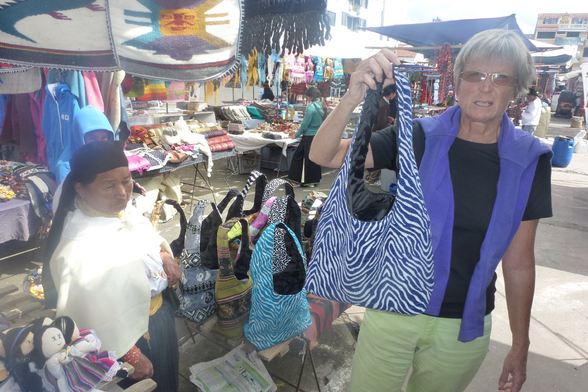 Fahren zum ‚Indian Market Los Ponchos in Otavallo‘. Bigi kauft wie verrückt Geschenke für jedermann/-frau: Tasche, Paschmiraschals, herzige kleine Latzhosen für die Enkel unserer Freunde, ein auf Ziegenfall gemaltes naives Bild, hundert Samichläuse (Fingerpuppen) und einen Panamahut für Thomas. Nachher zum Kratersee ‚Lago Cuicocha‘. Der Prospekt mit der Strassenkarte ist so schlecht, dass wir den Lago nicht auf Anhieb finden. Also Passanten paarmal fragen und immer wieder wenden.