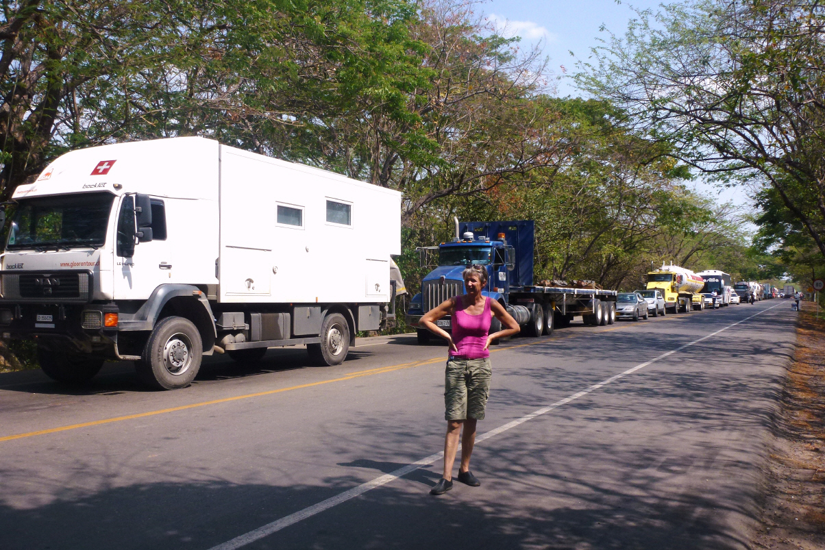 Wie üblich bis morgens um zwei Uhr laute Musik. Wir schmoren im eigenen Saft. Am Morgen dann wieder ein Bad im Meer und Kaffee trinken beim Amerikaner. Über Belen, Liberia an die Grenze Costa Rica/Nicaragua. Acht Kilometer vor der Grenze riesiger LKW-Stau. Wir zählen über 350 LKW, ca. 8 km und dies alles auf unserer Fahrbahn. Wir überholen auf der Gegenfahrbahn. Müssen immer wieder zurücksetzen wegen des Gegenverkehrs. Beim Rückwärtsfahren streift Kaspar bei einem wartenden LKW den Rückspiegel. An der Grenze werden wir von Geldwechslern belagert. Einer davon ist sehr hartnäckig. Er hilft uns beim Grenzübertritt. Hier geht es chaotisch zu. Viele LKW-Fahrer warten schon über eine Woche auf die Abfertigung. Sie liegen in den Hängematten unter den Fahrzeugen. Selbstverständlich sind die fliegenden Händler wieder da. Auf der Nicaragua Seite zuerst die Desinfektion. Bis wir hier alle Polizei und Zoll-Unterschriften zusammen haben dauert es einige Zeit. Bigi stinkt es so herum zu stehen in der brütenden Mittagshitze! Der ganze Zollübertritt dauert etwa 3 Stunden. Können uns also nicht beklagen.