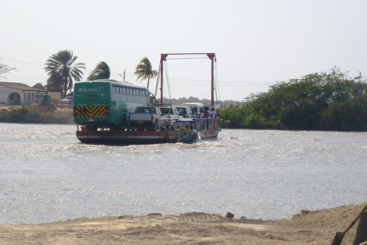 Machen einen kurzen Spaziergang am Sandstrand. Also heute nun nach ‚Cartagena‘. Denken so zwei Stunden, aber er werden wieder sieben! Bei einer Grossstadt finden wir prompt die Abzweigung nicht. Diese Idioten: zuerst Wegweiser geradeaus, aber dann 20 m weiter unter der Brücke ein kleiner weisser Wegweiser nach rechts! Bigi dreht eine Ehrenrunde bis zum nächten ‚Retorno‘. Zweiter Versuch: sie überholt einen anfahrenden Bus und es reicht nicht mehr zum Spurwechsel und abbiegen. Habt ihr Kaspar schon mal ausrufen gehört? Aller guten Dinge sind Drei und es klappt! In ‚Cartagena‘ suchen wir die ‚Isla de Baru‘. Na ja, die Sandpiste ist gesperrt und das Navi weiss auch nicht mehr weiter. An jeder Ecke fragen. Dann stehen wir vor einer wackligen Fähre. Auch das noch! Heute ist Samstag und viele Autos warten.