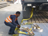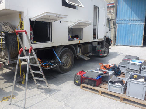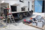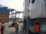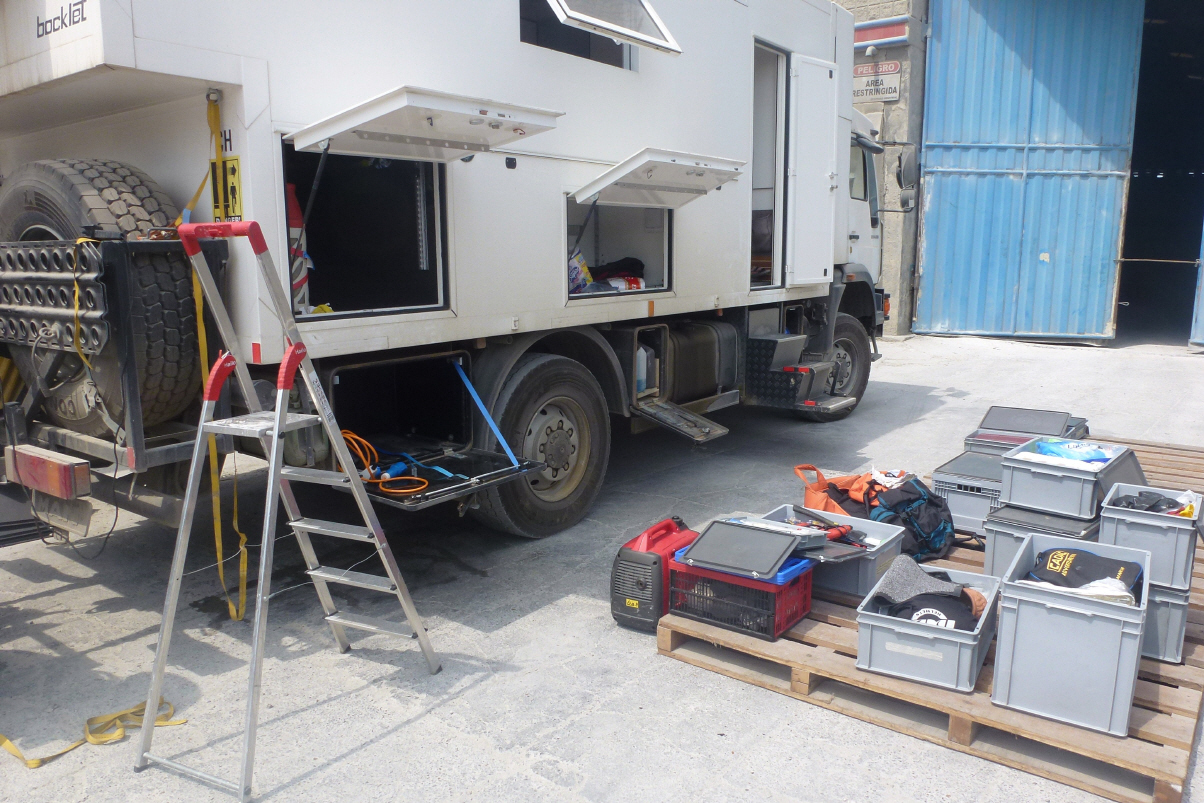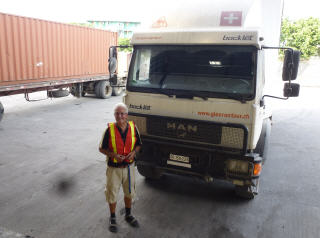Heute verladen wir unseren MAN auf den ‚Flat Rack‘. Kaspar ist schon um halb acht bei Ernesto im Büro. Pünktlich fahren die Zwei zum Hafen, aber ein Motorradunfall produziert einen riesen Stau. Nach kurzer Wartezeit kann Kaspar mit dem bereits sehr schmutzigen Camper zum Zoll und Drogeninspektion fahren. Die Hilfsarbeiter bringen vier Paletten und legen diese schön der Länge nach neben den Camper. Kaspar wird gedeutet, alles vom Camper auf die Paletten zu legen, den Honda herunter zu lassen und die Blache zu entfernen. Wir haben doch so einiges eingepackt. Also dann mal los an die Arbeit. Es ist auch heute wieder sehr heiss und das Shirt ist schnell durchgeschwitzt. Nicht vergessen, in den Hafen kann nur wer lange Hosen, geschlossene Schuhe, Warnweste und Helm trägt. Die Sonne brennt unerbittlich. Endlich kommt eine Polizistin und fängt mit der Inspektion an. Im Innenraum werden alle Kästen geöffnet und stichprobenhaft geprüft. Dabei muss der Kasten vollständig geleert sein. Bei den Bonbons stibitzt sie schon mal eines. Endlich ist im Innenraum alles durchsucht, aber die Kästen müssen noch geöffnet bleiben. Aussen wühlt sie in sämtliche Ersatzteilkisten und sucht nach Drogen. Alle gestapelten Kisten müssen nun geöffnet auf die Paletten gestellt werden. Die Polizistin verschwindet und kommt nach einiger Zeit wieder mit dem Drogenhund. Dieser schnüffelt überall herum und muss auch noch in den Wohnraum. Auch hier wird alles beschnuppert. Sie kann den Drogenhund gerade noch vom Besuch unseres Bettes fernhalten, aber über unsere Sitzpolster speedet er. In die Fahrerkabine will oder kann der Hund nicht hinauf springen. Nun heisst es wieder einpacken. Nach einer Stunde arbeiten und einer halben Stunde Wartezeit kommt ein anderer Polizist und versiegelt alle Klappen und Türen mit speziellen Klebstreifen. Die Fenster sind ihm zu hoch. Die ganze Prozedur dauert bis zum Mittag, aber jetzt ist Mittagspause angesagt. Also zurück zu Ernesto ins Büro und warten. Kaspar verspürt von der Anspannung keinen Hunger und begnügt sich mit einer Cola. Er steht vor Dreck und stinkt nach Schweiss. Zurück im Hafen, während Ernesto den ‚Flat Rack‘ sucht kann er im kühlen Restaurant warten. Nach eineinhalb Stunden kommt er wieder mit positivem Bericht, jedoch etwas genervt. Alles okay, nur leider ist der Auffahrkeil nicht aufzutreiben! Nach einer weiteren Wartezeit können dann Kaspar und auch der gleichzeitig anwesende Franzose in Begleitung der zwei Drogenpolizisten auf den ‚Flat Rack‘ fahren. Nun werden auch noch die Fahrerhaustüren mit dem speziellen Klebeband versiegelt. Dieses Prozedere wurde erst Anfang März eingeführt. Die zwei Verladearbeiter beratschlagen einige Zeit wie sie den MAN sichern wollen. Nun können Ernesto und der todmüde, dreckige Kaspar wieder zurück ins Büro und gleich weiter mit dem Taxi ins Hotel fahren. Bigi hat den ganzen Tag im Hotel gewartet und sich bereits einige Sorgen gemacht, denn es ist inzwischen 18Uhr.