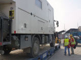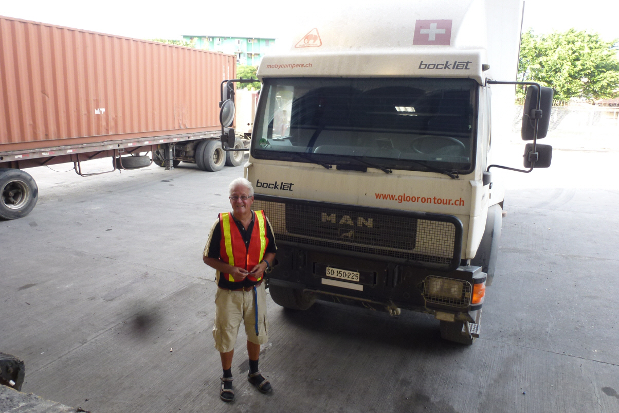 Am Morgen holt Ernesto Kaspar ab und sie fahren hintereinander zum Hafen. Bigi bleibt im Hotel. Im Hafen angekommen wird Warnweste und Helm verteilt. Lange Hosen und geschlossene Schuhe waren bereits vorgeschrieben. Mit dem MAN auf die Waage. Dieselbe zeigt nun voll, mit vollem Wasser- und Dieseltank, 10‘750 kg an. Nun heisst es einfach warten – ihr solltet mal Kaspar sehen, er ist inzwischen ‚die Ruhe in Person‘! Ernesto geht von Schalter zu Schalter und Kaspar muss lediglich unterschreiben. Was er alles unterschrieben hat, kann er nicht nachvollziehen. Den Song kennt ihr ja: ‚es chunnt mir alles spanisch vor….‘. Ernestos Frau ist unterwegs mit einem Franzosen und einem Argentinier, deren Fahrzeuge aus dem Zoll kommen. Wir exportieren nach Panama, sie importieren nach Kolumbien. Nach drei Stunden ist Ernesto mit dem Papierkram fertig. Leider können wir heute den MAN nicht auf den ‚Flat Rack‘ zurren, da kein Platz im Hafen. Also zwangsläufig am Freitag noch einmal hin.