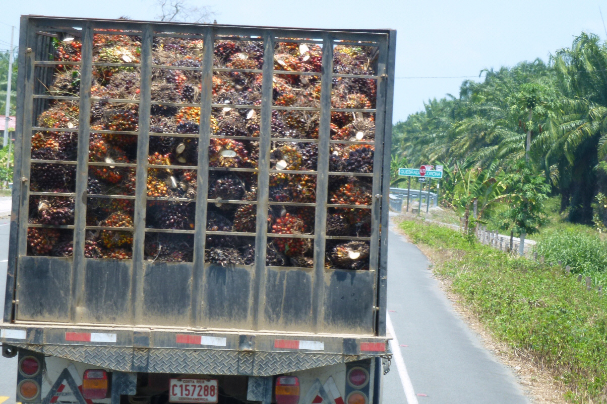 Im ersten Ort ‚Rio Claro‘ beziehen wir erst mal Geld. Hier in ‚Costa Rica‘ sind dies ‚Colones‘. Der Wechselkurs: etwa 600 Colones = 1 CHF. Weiter auf der ‚Panamericana/Routa 2‘ bis ‚Palmar Norte‘ und dem Strand entlang (Routa 34) via ‚Quespo‘ zum Nationalparkeingang ‚Manuel Antonio‘. Unterwegs sind fahren wir an grossen Palmölplantagen vorbei. Es scheint, dass gerade die Ernte eingefahren wird, denn es sind viele beladene Lastwagen unterwegs.