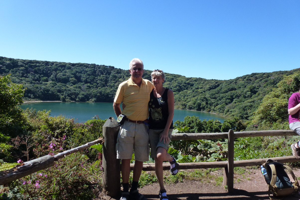 Wunderschönes Wetter. Sind daher bereits um 8 Uhr beim Nationalparkeingang ‚Volcan Poas‘. Kurze Wanderung bis zum unteren Kratersee. Dieser ist schwefelhaltig, dampft ein wenig und stinkt. Aber sehr eindrücklich. Hier wird viel Schweizerdeutsch gesprochen. Zum oberen Kratersee. Hier fotografieren wir uns am selben Ort wie 2004 – dieses Foto wurde für unsere Hochzeitskarte verwendet.