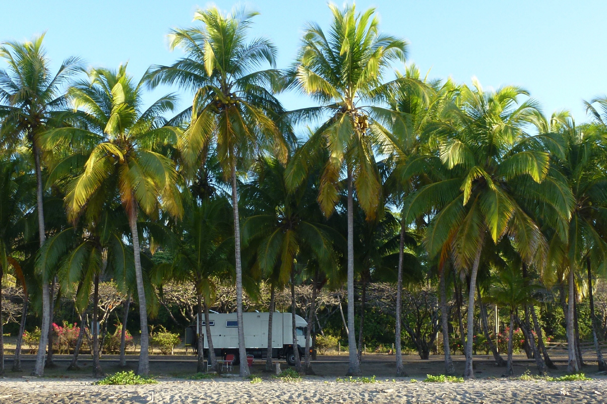 Es hat die ganze Nacht geregnet, keine Chance etwas vom Vulkan zu sehen. Fahren dem Arenal See entlang bis zum Schweizer aus Merlischachen. Wer steht hier dicht gedrängt mit offenen Fenstern; die Camper-Gruppe ‚Sea Bridge‘. Niemand weit und breit zu sehen und so klemmen wir nur zwei Visitenkarten unter die Scheibenwischer von einem Solothurner und einem Bocklet-Camper. Trinken schlechten Kaffee und fahren weiter rund um den See und nachher zum schönen Pazifikstrand ‚Playa Carillo‘. Soll der schönste Strand von Costa Rica sein. Stehen unter hohen Kokospalmen. Ein Costa Ricaner hat sich selbst aus seinem Mercedes ausgeschlossen. War mit dem elektronischen Türschlüssel im Meer baden. Helfen ihm mit einem feinen Kreuzschraubenzieher aus. Er darf ihn dann gerade behalten. Bekommen als Gegengeschenk zwei harte Melonen. Am Ende muss er das hintere Dreieckfenster doch noch einschlagen. Eine Tessinerin aus Airolo kommt mit dem Fahrrad vorbei. Ihr Mann ist frühzeitig pensioniert und sie bauen sich hier ein kleines Haus. Sie aber macht keinen glücklichen Eindruck.