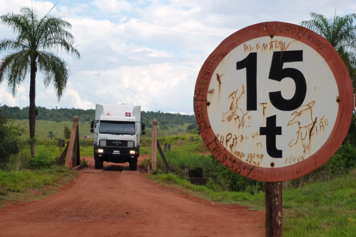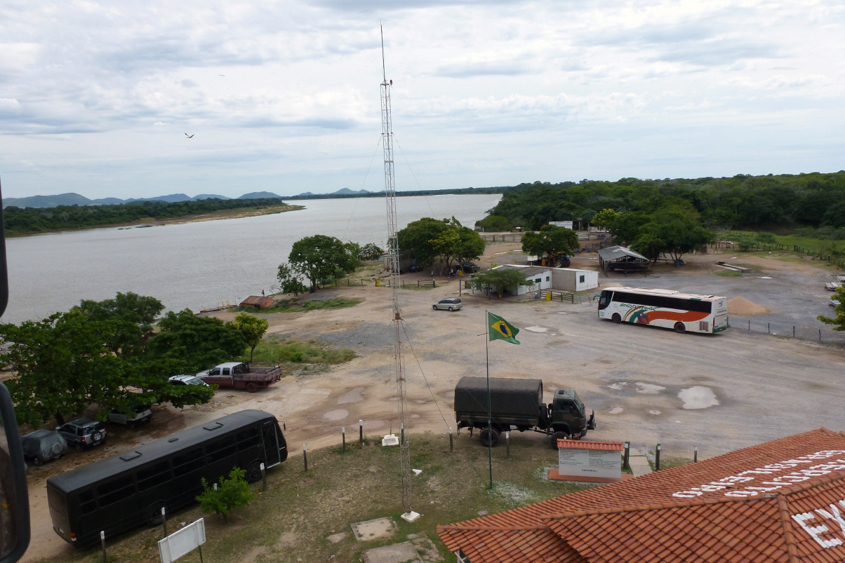Sind um sieben Uhr bereits auf den Beinen. Die zweite Batterie ist etwas schwach, so laden wir sie mit dem Generator auf. Eigentlich würde man meinen, dass durch die grosse Sonneneinstrahlung auf die Sonnenkollektoren die Batterie immer voll ist. Dem ist aber gar nicht so. Der Grund ist, weil wir meistens im Schatten stehen. Bigi fährt die ersten 30 Kilometer Erdpiste. Bei der geteerten Strasse angekommen pumpt Kaspar die Reifen wieder auf 6,2 atü. Ein Toyota hält an und ein Ehepaar verwickelt uns in ein Gespräch: woher, wohin, Blick in den MAN, obligate Fotos, Schoggistängeli. Die 40-jährige Frau trägt eine Zahnspange. Dies ist uns hier schon des Öfteren aufgefallen, dass viele Frauen jeglichen Alters Zahnspangen tragen. Ob dies ein brasilianischer Mode-Trend ist? Weitere 100 km bis Corumba. Hier füllen wir die restlichen Reales in den Dieseltank. Mit den letzten Münzen einen Snack kaufen, ein kurzer Mittagshalt. Nur noch 8 Kilometer bis zur brasilianisch/bolivianischen Grenze. Kurz vor der Grenze müssen wir noch den Wegzoll von 3.75 Reales bezahlen. Wir aber sind blank! Mit Dollars könnte man bezahlen. Da kommt Bigi auf die Idee, dass wir im Fahrerhaus ja immer ein kleines Blechdösli mit Münzen haben. Und siehe da, es reicht sogar! Heute zum zweiten Mal grosszügig schenken wir die restlichen Münzen der Frau in der Zahlstelle. Sie strahlt und bedankt sich. Nach unserer Uhr um 12.55 Uhr am Zoll angelangt. Oh Schreck, der brasilianische Zoll schliesst um 13 Uhr, da morgen brasilianischer Nationalfeiertag ‚Tag der Republik‘ ist. Es ist nichts zu machen, die Tür bleibt verschlossen und der Beamte daneben sagt mit einem Achselzucken: Manana 9 Uhr. So stehen wir auf dem Parkplatz daneben und warten. Es regnet stark und kühlt ab. Es sind sehr viele Leute hier unterwegs, ein- und aussteigen aus Busen und Taxis. Gleich nach der Grenze in Bolivien ist ein grösseres Zollfrei-Zentrum.