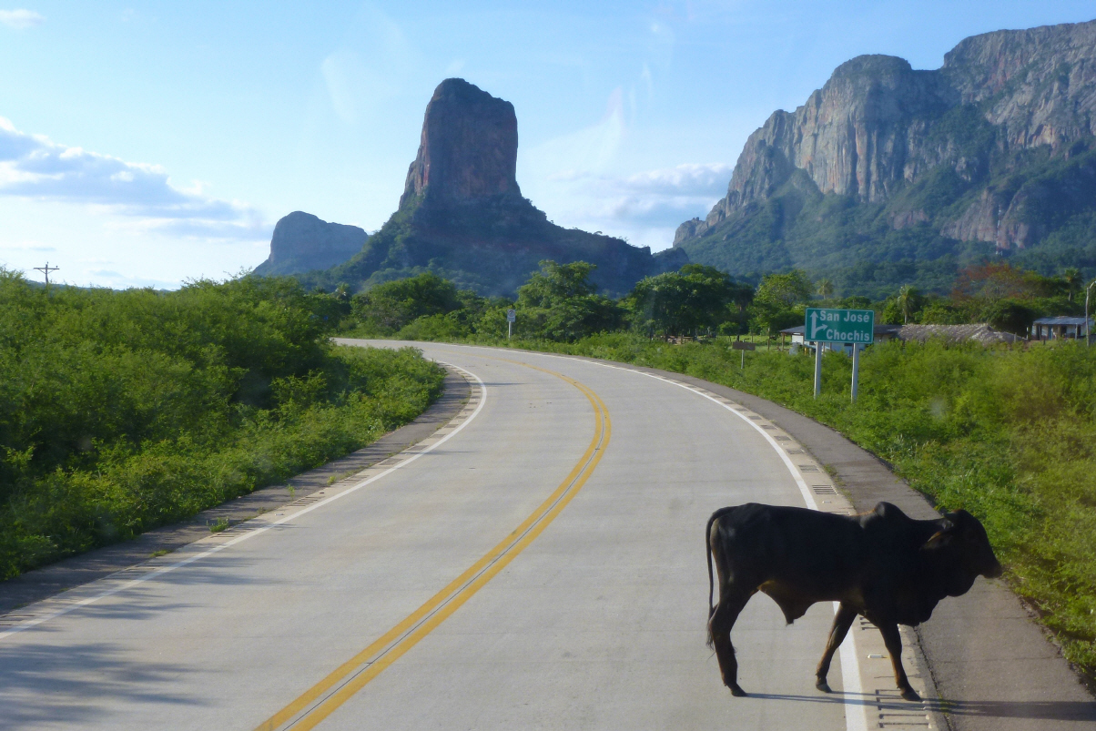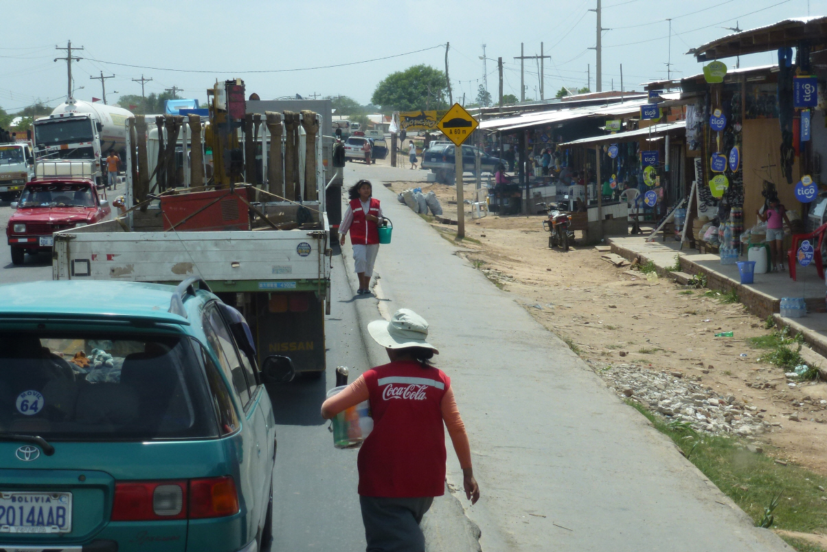 Fahren auf der 502 und später auf der 9 nach Santa Cruz de la Sierra. In San Javier schauen wir uns die letzte Jesuitenkirche von aussen an. Dann über kurvige Berg- und Talbahn durch schönes, hügliges Gelände in die bolivianische Tiefebene. Hier ist viel Verkehr und starker Wind wirbelt den Staub auf. Die Dörfer, die wir durchfahren, sind noch schmutziger als normal. Es herrscht viel Gedränge und es wird alles Mögliche und Unmögliche angeboten. Müssen mindestens viermal durch den Strassenzoll. Beim ersten Mal haben wir anscheinend zu viel bezahlt. Bekommen jedes Mal einen Stempel aufs Ticket und dürfen passieren. Bei der letzten Zahlstelle öffnen wir beide gleichzeitig das Fenster und oh weh, unser Ticket fliegt davon. Kaspar sieht noch wohin. Bigi spurtet hinterher.