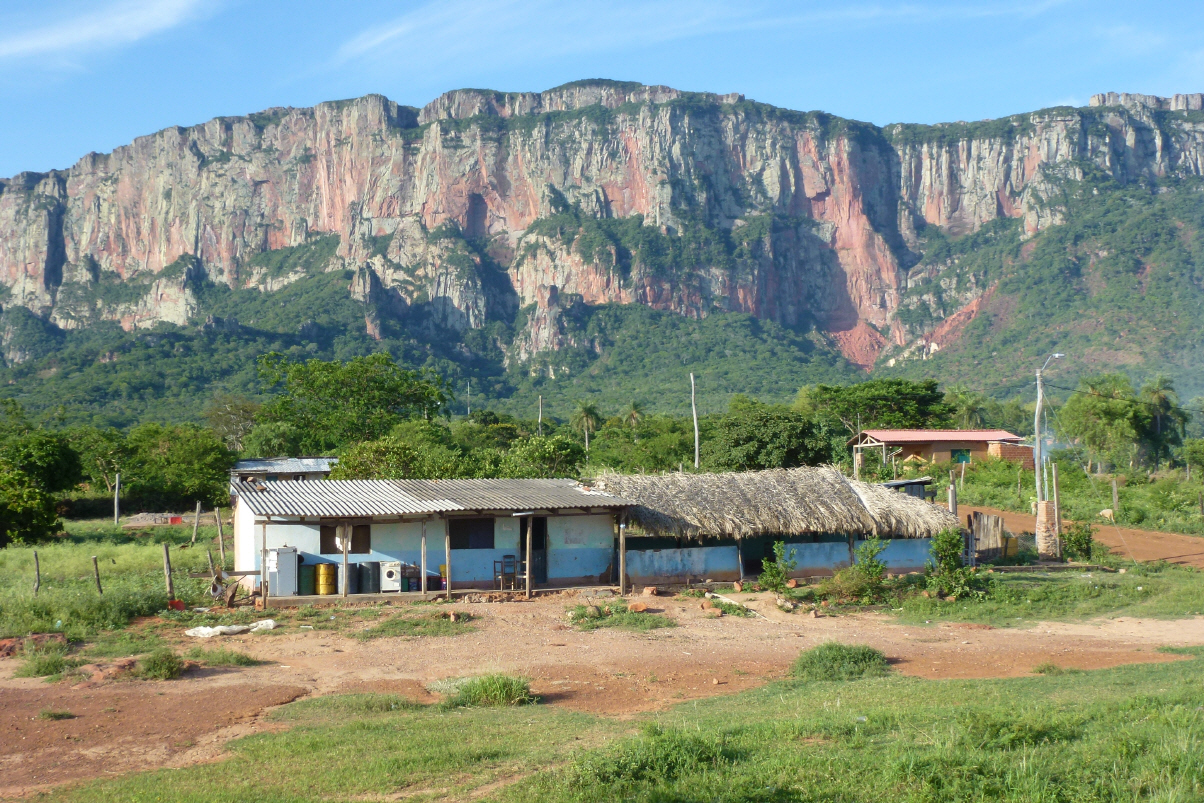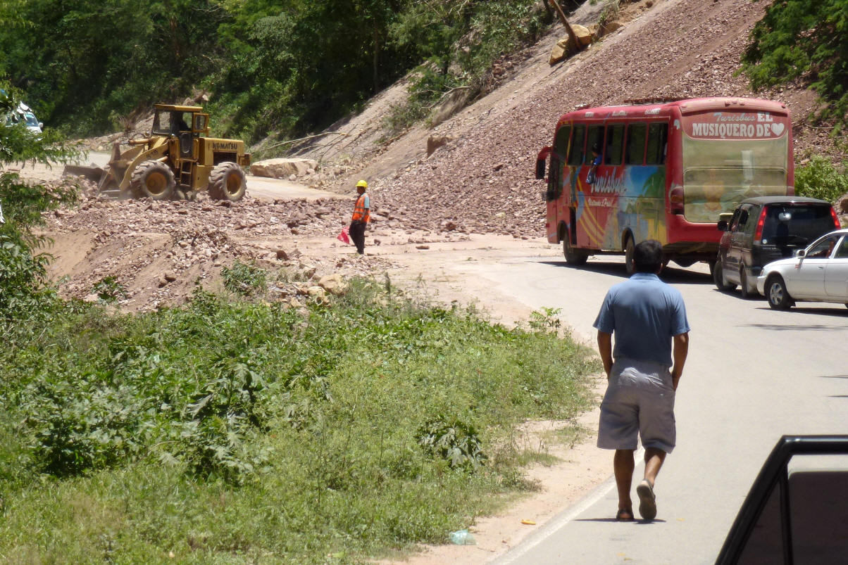 Morgendliches Bad im Pool. Zurück nach Santa Cruz. Auf dem äussersten Stadtring suchen wir die Wegweiser Richtung Cochabamba und unserem Ziel, der Kleinstadt Samaipata. Mit Fragen, aber ohne Wegweiser, finden wir sogar die Ausfahrtsstrasse aus dieser Grossstadt. Plötzlich sehen wir Berge und die Strasse steigt an. Hier ist wohl Wassermelonenzeit, denn am Strassenrand werden viele verkauft. Wir bevorzugen jedoch die exotischen Früchte und kaufen tüchtig ein: Ananas, Papaya, Mango und Passionsfrucht. Die Strassenverkäuferin trägt eine Schürze mit der Aufschrift ‚Kleinkredite‘, ansonsten sie wohl ihr kleines Geschäft nicht betreiben könnte. Ausserplanmässiger Stopp, da ein Erdrutsch die Strasse versperrt. Oberhalb der Strasse ist ein Trax im Einsatz, der die Steine nach unten schiebt. Auf der Strasse ein anderer Trax, der Steine und Dreck wegschiebt und die Strasse immer wieder für den Verkehr passierbar macht. Hinter uns steigt ein Paar aus einem Kleinbus. Natürlich zwei Schweizer! Sie sind von Lima aus seit einem Monat unterwegs und sich hier oben in den Bergen ein paar Tage erholen. 20 km vor Samaipata bei den Wasserfällen in den Naturpools kann man baden – leider zu wenig Wasser.