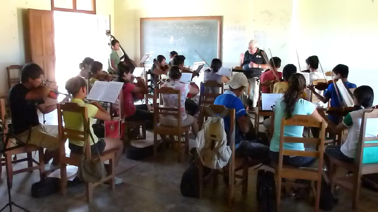 Mehrere Kinder zwischen fünf und zehn Jahren kratzen auf ihren Streichinstrumenten herum. Ein Schulzimmer nebenan tönt es schon sehr gut. Ein Franzose gibt hier den älteren Streichern eine Orchesterstunde. Sie spielen gut. Der Franzose erklärt uns, dass eine Stiftung den Musikunterricht organisiert. Es wird auf Einzelunterricht und Theorie verzichtet und alles im Orchester eingeübt. Im Gang spannt ein Mann Geigenbogen im Akkord. Bei der Touristeninfo erhalten wir Prospekte über die verschiedenen Jesuiten Reduktionen, welche wir in den nächsten Tagen besuchen wollen. Am Rande des schönen Hauptplatzes essen und trinken wir eine Kleinigkeit. Sehen ein paar Mennoniten in ihrer speziellen Kleidung. Auf dem Heimweg noch Pause in einer Bäckerei. Kaspar ist wieder einmal nicht sehr erfreut über die trockenen, staubigen Süssigkeiten. Nachher baden, lesen und liegen.