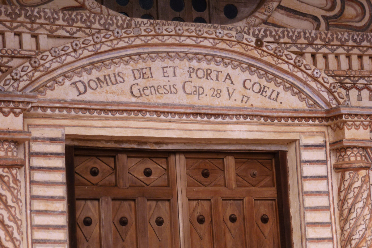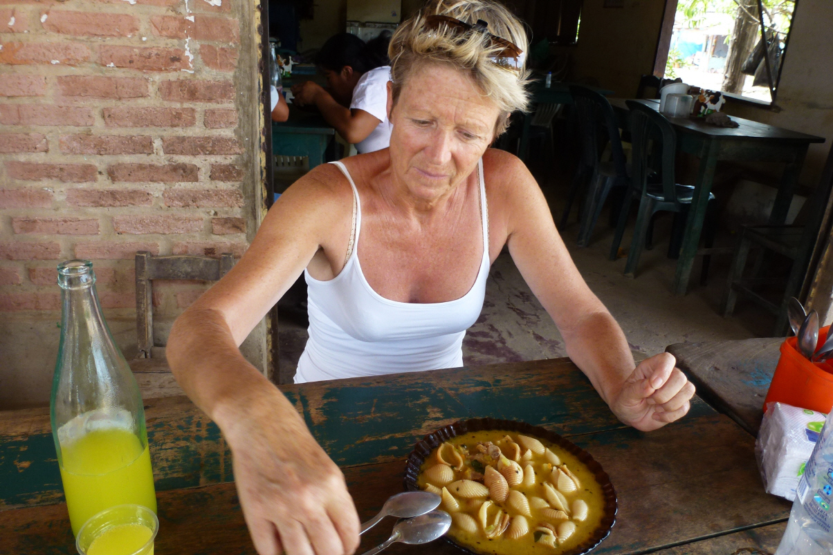 In Concepcion angekommen wird zuerst getankt und Geld aus dem Bancomaten gezogen. Kaufen uns einen geflochtenen Fächer für etwas frische Luft. Kirche von aussen fotografieren. Fahren zum 3 km entfernten Camping am Fluss, was sich aber eher als Waschplatz der Einheimischen entpuppt. Wir sind uns auf Anhieb einig: kein Platz zum übernachten. Fahren zurück in die Seitengasse neben der grossen Kirche. Auf dem Pausenplatz nebenan wird mit lauter Musik ein Tanz eingeübt. Sind froh, dass wir vor dem Regen angekommen sind. Erdpiste und Regen, nein danke. Gehen am Hauptplatz ins Restaurant ‚Buen Gusto‘, ein kleines typisches Restaurant mit schön bepflanztem Innenhof. Dort sind einige Frauen, die spezielle Verpackungen für Weihnachten basteln. Wir geniessen das Salat-Buffet und auch Pollo Milanese. Bisher hat uns das Fleisch an den Hacken nicht angelacht und wir essen vegetarisch, ausser natürlich dem Salami (von Brasilien mitgenommen). Nach dem Essen gehen wir in den zweiten Teil der Messe in der schönen Kirche. Über dem Portal steht Genesis 28,17: ‚Dies ist Gottes Haus, die Pforte zum Himmel.‘ Die meisten Kirchbesucher sind Frauen. Viele tragen ein weisses T-Shirts mit der Aufschrift: Heute für dich, morgen für mich. Wenn sie das wirklich in die Tat umsetzen, so können ihre Mitmenschen sich glücklich schätzen. Die halbe Nacht hören wir im Schlaf die laute Musik, es ist eben wieder einmal Wochenende.