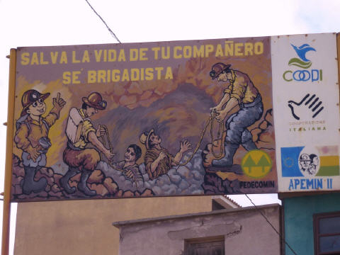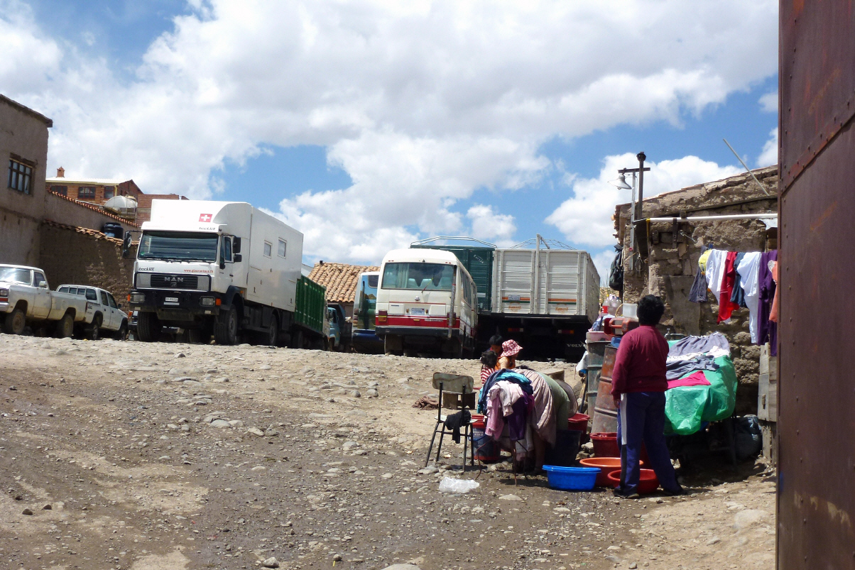 Kommen in Potosi an. Beim Tanken die grosse Überraschung: hier kostet der Liter Diesel für Ausländer 9.37 Bolivianos (CHF 1.30) - zweieinhalb Mal mehr als normal! Dies ist wegen dem langen Transportweg. Na ja, dafür ist der Tank wieder voll und somit haben wir genug bis La Paz. Suchen den Übernachtungsplatz. Finden die Strasse relativ einfach, aber den bewachten Parkplatz im Hinterhof gibt es in der Zwischenzeit nicht mehr. Also weiter suchen und fragen. Schlussendlich finden wir gar nicht weit entfernt einen sicheren, dreckigen, geschlossenen Hinterhofparking. Die Bolivianer-Familie, die dort haust und für den Parkplatz zuständig ist, macht einen guten Eindruck. Per Taxi in die Stadt. Eine Taxifahrt auf dem Stadtgebiet kostet pro Person umgerechnet 55 Rappen. In der lebhaften Altstadt buchen wir für morgen eine Silberminen-Tour zum ‚Cerro Rico‘. Im Internet-Kaffee versucht Bigi verzweifelt die Homepage aufzuladen: zwei Stunden, langsame Leitung und immer wieder Unterbrechung, bis der Laptop Akku leer ist, aber wir haben wieder einmal alle Emails. Nehmen einen Lunch im Restaurant und Bigi friert saumässig. Da sowieso alle Läden und Museum bis 15.30 Uhr geschlossen sind, zurück zum MAN und Bigi verschwindet sofort unter dem Duvet.