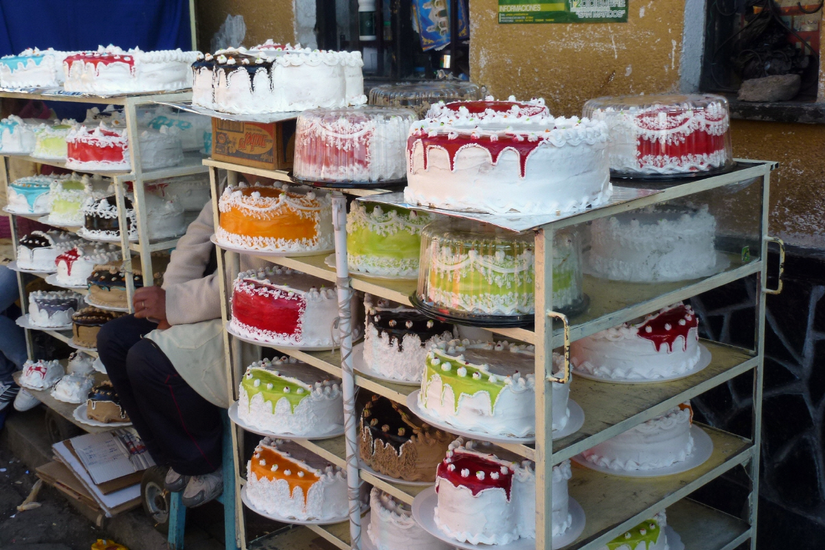 Später zurück in die Altstadt. Besuchen den Handwerker Markt, welcher uns jedoch enttäuscht und den Mercado Central. Hier werden riesige Torten am Strassenrand verkauft. Die Cremetorten sind dem Staub und Abgas der Autos voll ausgesetzt. Muss ja lecker sein! Apropos Abgas: hier riecht man noch die alten Autos und Kaspar wird es beinahe übel.