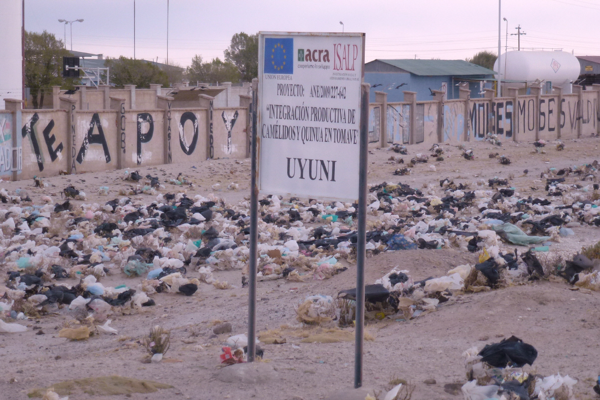 In Uyuni angekommen sind wir wieder einmal entsetzt über die vielen Plastiktüten, welche an kleinen Stauden hängen und über die ganze Erde verteilt sind. Riesen Sauerei! Auf dem Weg hierhin sind wir durch einen grossen Sandsturm gefahren. Uns kam es vor wie ‚Dantes Inferno‘. An der Hauptstrasse beim Bahnhof treffen wir auf ein Holländer Ehepaar. Sprechen zusammen und verstehen uns auf Anhieb glänzend. Wir kommen überein, morgen eine Privattour auf dem ‚Salar de Uyuni‘ zu machen und buchen zusammen beim Touroperator. Beim Pizza essen schwatzen wir und tauschen wieder einmal Tipps aus.