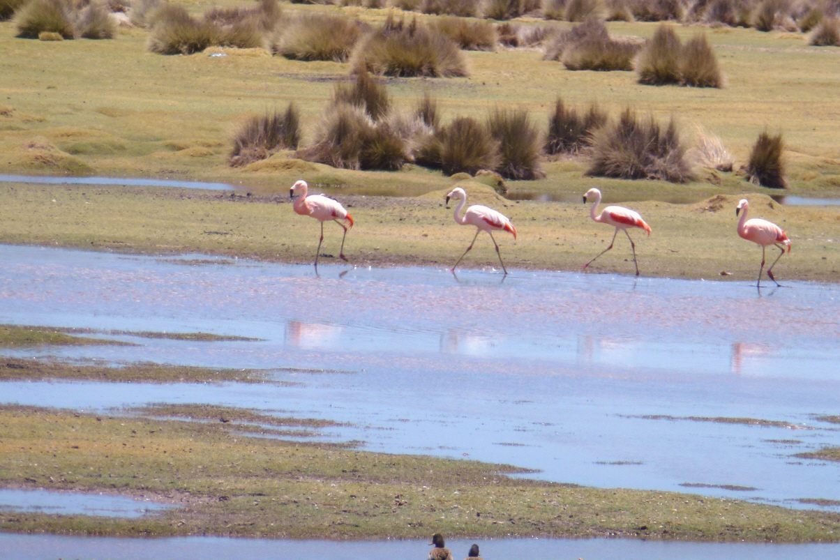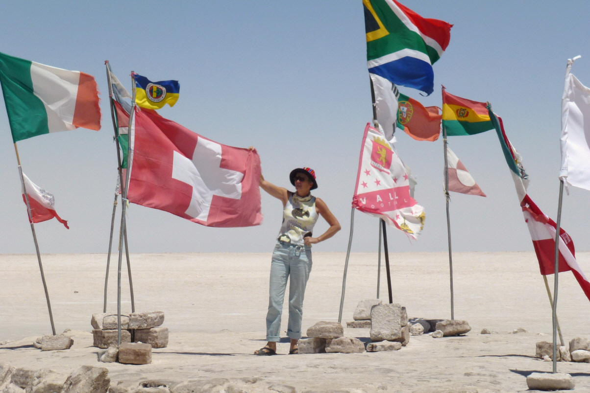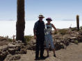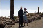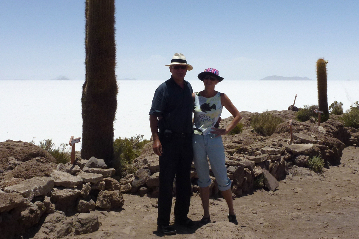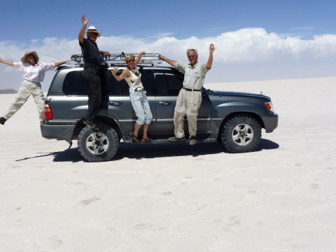 Um 9 Uhr geht’s mit ‘südamerikanischer Pünktlichkeit’, also eine halbe Stunde später, los. Über schlechteste Piste vorbei am Flughafen zum ‚Salar de Uyuni‘. Sehen uns die Salzverarbeitung an. 50 kg Salz à je 1 kg, werden in Beutel verschweisst und das Ganze kostet 13 Bolivianos (2 Franken). Wir bekommen ein Kilo Salz geschenkt. Weiter zum alten Salzhotel, das heue ein Museum ist. Vor dem Hotel wehen viele Fahnen, darunter eine rechteckige Schweizer-Flagge. Kaspar bekommt jedes Mal Vögel, wenn er eine rechteckige Schweizerfahne sieht. Dann auf den Salar zur Salzgewinnung. Man muss sich den Salar topfeben vorstellen, wie ein Meer. Bei der Fahrt auf dem Salar muss der Fahrer sehr aufpassen, dass er in keine Wasserlöcher fährt. Sonst finito Abenteuer und schaufeln, schaufeln und nochmals schaufeln. Wir wissen von Reisenden, welche total bis zu den Achsen im Salzsee stecken geblieben sind. Sie brauchten zwei bis drei Tage, um den Camper mit Hilfe von Bolivianern frei zu schaufeln. Unser Fahrer fliegt in horrendem Tempo über den Solar. An schwierigen Stellen muss er so schnell fahren, um die gefährlichen Wasserlöcher zu ‚überfliegen‘. Zum Teil fährt er wie ein Spinner und Loet versucht ihn immer wieder auf Tempo 50 Miles zu bremsen. Auf der ‚Isla Incahuasi‘ (Isla del Pescado) stoppen wir fürs Mittagessen. Es gibt Lama-Kotelett. Schmeckt durchzogen. Die Insel ist voll riesiger Kakteen, welche gerade blühen. Ein schön angelegter Rundweg führt durch die Kakteen. Vom Hügel aus geniessen wir die wunderschöne Aussicht über den Salar. Weiter zum kleinen Ort ‚Tahua‘, der vom Vulcano Tunupe (5‘431 m) überragt wird. Auf der Rückfahrt wähnen wir uns wie auf einer riesigen, glitzernden Schneeschicht. Die Holländer beschweren sich über den ‚Helldriver‘ und wir sind einfach froh, heil zurück zu sein. Nach dem Nachtessen tauschen wir mit Gerda und Loet Strassenkarten und Reiseführer.