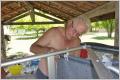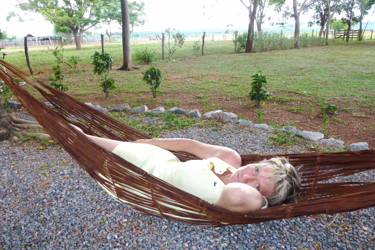 Nachher eine Siesta in der Hängematte. Kaspar findet es sehr unbequem. Auf dem Heimweg zieht ein starkes Gewitter auf. Wir warten bei einer Einfahrt bis es vorbei gezogen ist und trinken Kaffee. Die Erdpiste war kaum nass. Abends wird Kaspar von Mücken gefressen und er flieht in den einigermassen sicheren Camper.