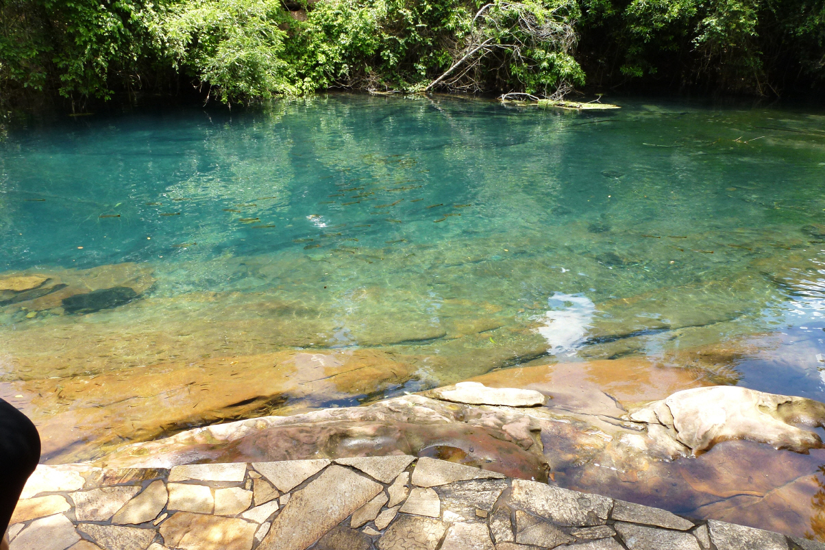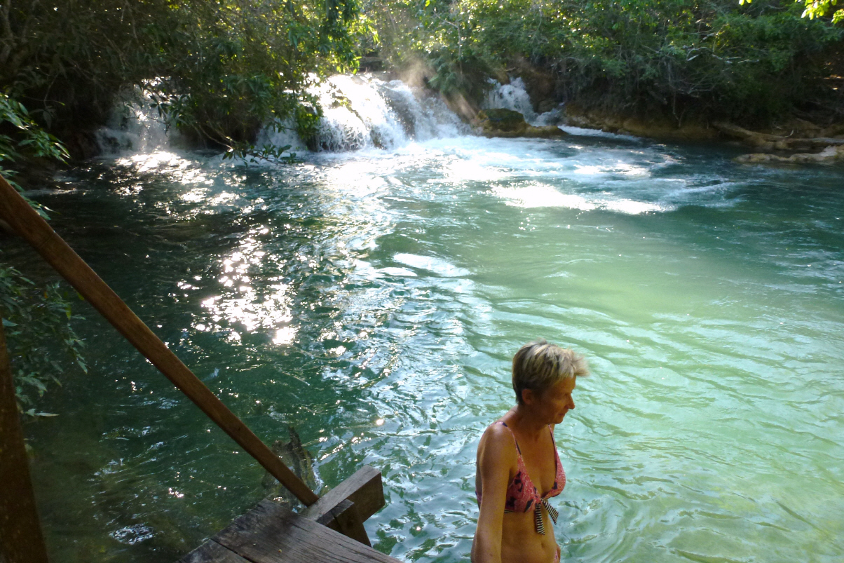 Leider leuchtet die EDC-Lampe immer noch. In die kleine eco-touristische Stadt Bonito. Bei einer der vielen Touren-Agenturen informieren wir uns und buchen für morgen eine Tour zu den Grotten. Hier darf man alles nur mit Führern unternehmen. Nach dem Bummel durch Souvenirläden geht’s endlich zum Camping, der sich 6 km ausserhalb der Stadt befindet. Schön gelegen, keine Leute nur ein Franzose steht mit seinem Toyota hier. In 200 m Entfernung ist ein glasklarer Fluss mit Stromschnelle. Wir baden, herrlich!