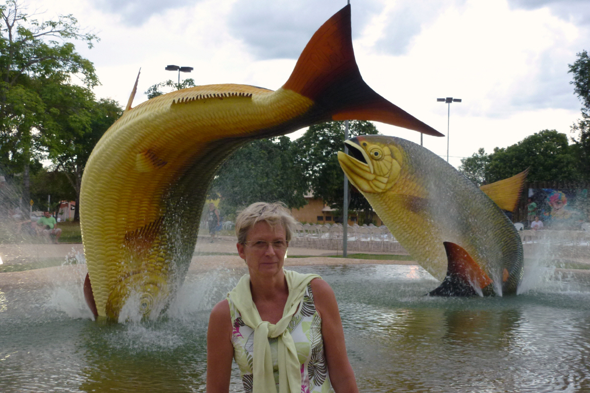 Auf einem kleinen Truck fahren wir 4 km in den Busch. Marschieren 40 Minuten durch den Urwald. Sehen ein paar grosse Aras (Papageie), riesige Bäume und zweimal ein Rudel Wildschweine. Wildschweine sind ungefährlich, denn sie haben einen sogenannten Tunnelblick: sie sehen nur am Boden und nicht nach vorne. Am Fluss (breiter Bach) ‚Rio da Prata‘ angekommen. Der Fluss führt wahnsinnig klares durchsichtiges Wasser. Wir steigen in den Rio und probieren Taucherbrille und Schnorchel an. Bigi hat Panik, dass sie Wasser schluckt oder nicht mehr schnaufen kann (hat das letzte Mal vor 35 Jahren in Israel im Roten Meer geschnorchelt). Dann lassen wir uns im Wasser mit der Strömung treiben. Zum Glück haben wir auf Anraten eines anderen Teilnehmers eine Schwimmweste übergezogen. So schwimmt man richtig auf dem Wasser. Unter Wasser ist eine wunderschöne Welt zu bewundern und wir fühlen uns wie in einem grossen Aquarium. Grosse, bunte, flache, bis 25 kg schwere Fische tummeln sich hier. Wunderschön und zum anfassen nah! Fische sind bis 50 cm gross – ohne Fischerlatein! Die Tour besteht aus drei Schwimmetappen, total ca. 3 km und dauert etwa 3 Stunden! Langsam wird es Bigi zu viel. Sie strengt sich sehr an, obwohl man auf dem Rio fast keine Anstrengung braucht, nur richtig atmen und nach unten schauen. Die letzten 400 m fährt sie auf einem kleinen Boot mit.