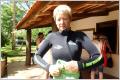 Müssen früh aufstehen, 09.30 Uhr dort sein und es sind 52 km Erdpiste. Sind zeitig dort, aber vor uns sind noch zwei Gruppen zu acht Personen und wir müssen eine Stunde warten. Neoprenkleider plus Schuhe und Taucherbrille mit Schnorchel fassen. Trotz 30 Grad schlottert Bigi vor Angst.